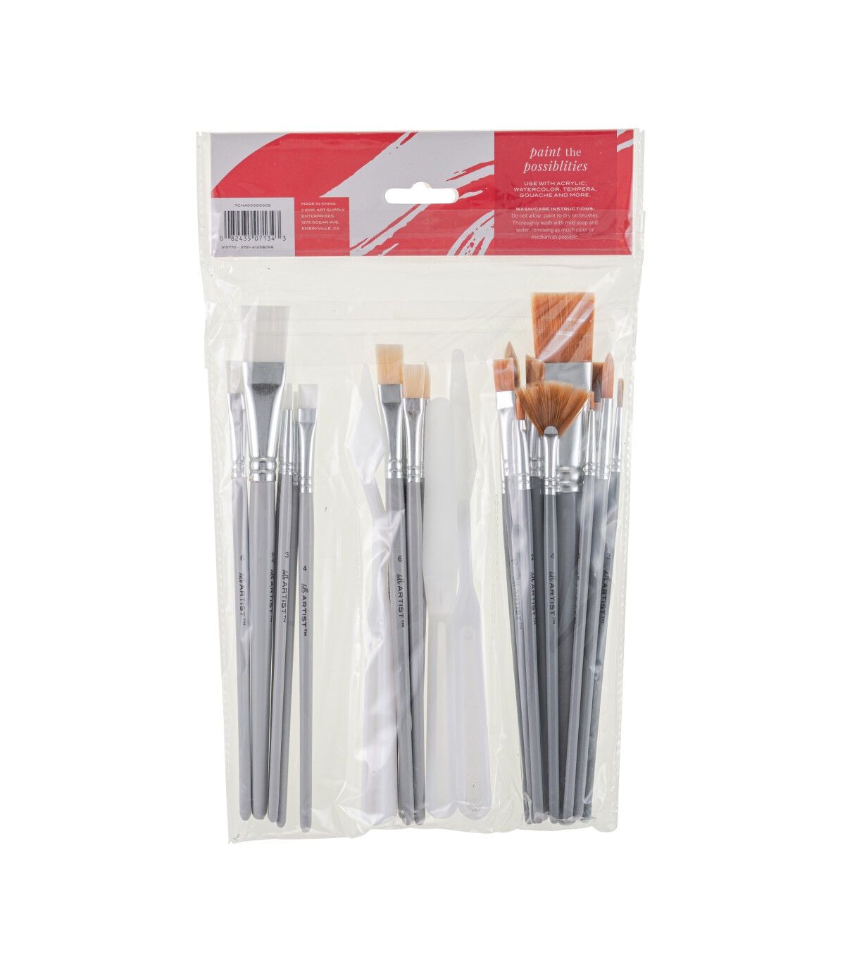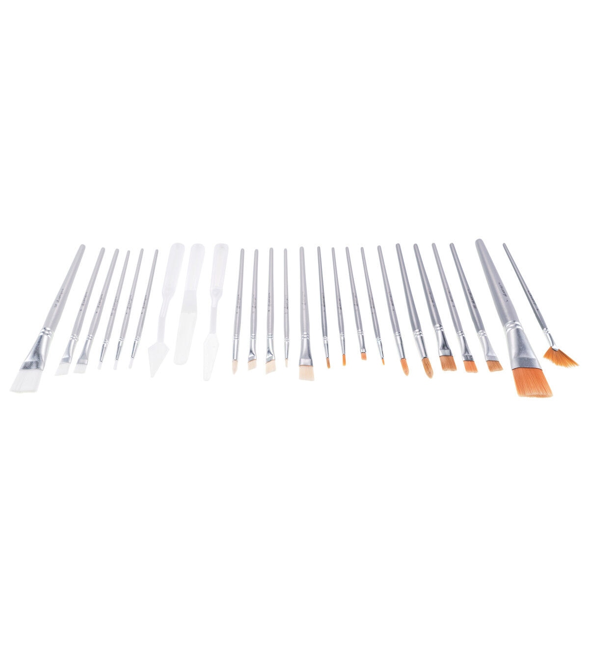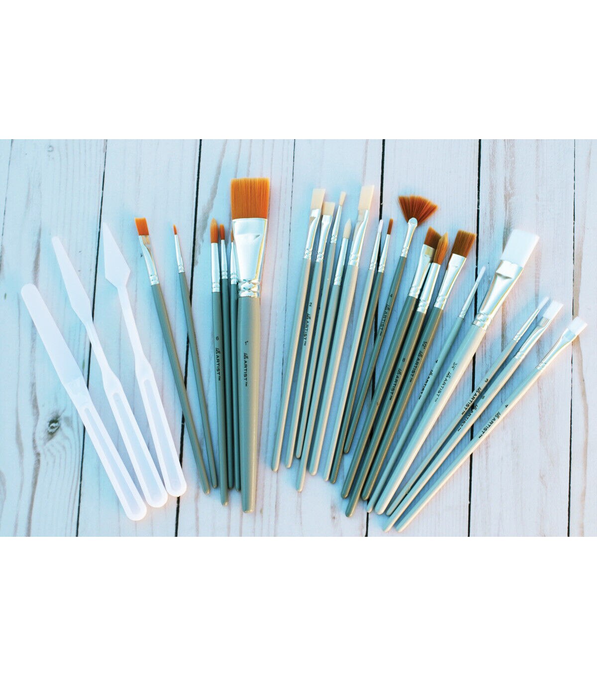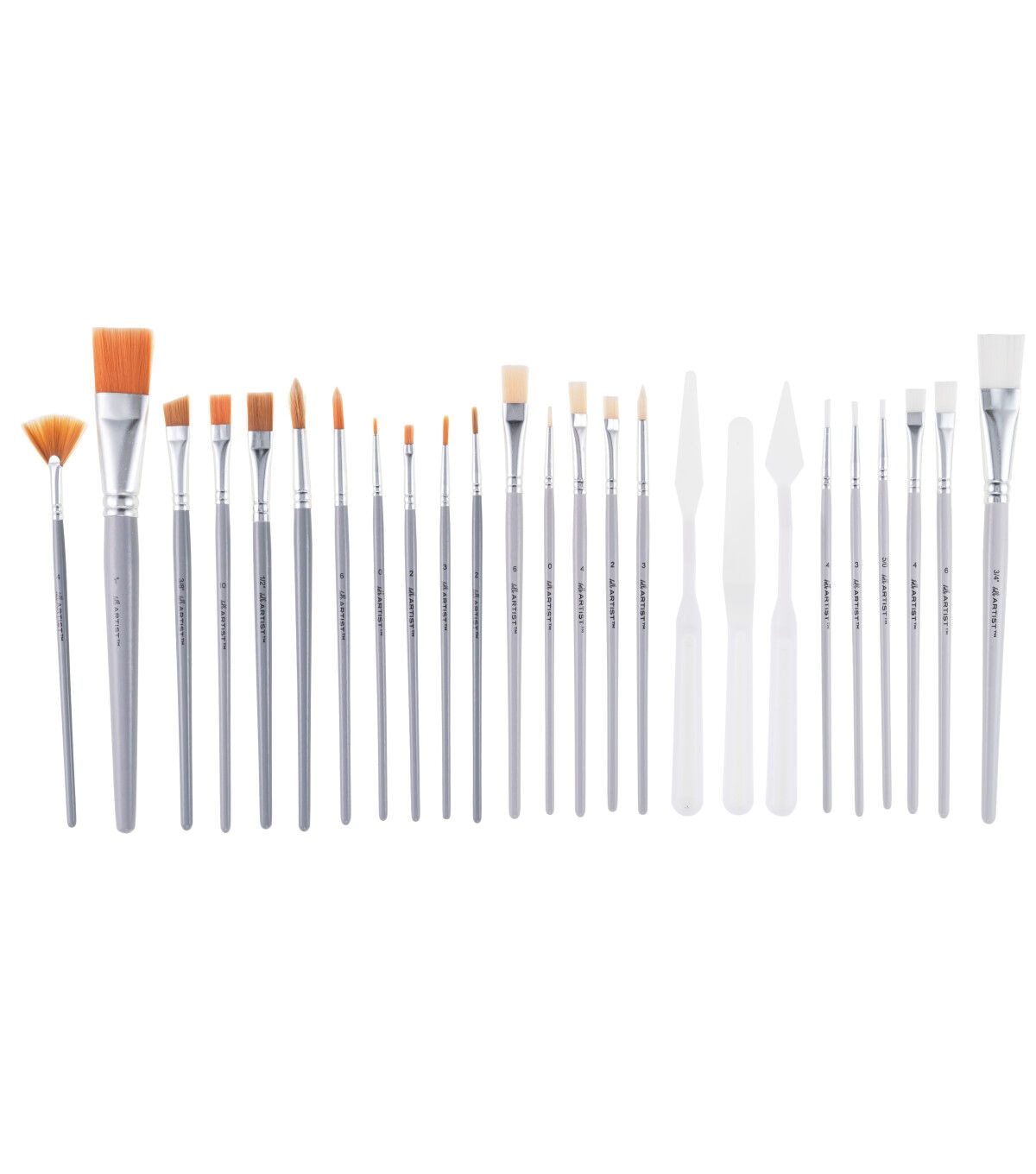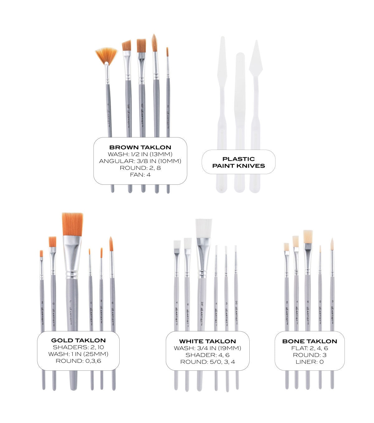 These brushes are for use with acrylic, watercolor, tempera, gouache, and more. They are suitable for all creatives – from the budding artist to the lifelong crafter. The plastic paint knives can be used to mix and apply media, manipulate texture, and clean up unused paint. The set contains the following: Gold Taklon - Shaders: 2, 10, Wash: 1 in (25mm), Round: 0, 3, 6. White Taklon - Wash: 3/4 in (19mm), Shader: 4, 6, Round: 5/0, 3, 4. Bone Taklon - Flat: 2, 4, 6, Round: 3, Liner: 0. Brown Taklon - Wash: 1/2in (13mm), Angular: 3/8in (10mm), Round: 2, 8, Fan: 4. Plastic paint knife (3 pieces). Wash/Care Instructions: Do not allow paint to dry on brushes. Thoroughly wash with mild soap and water, removing as much color or medium as possible.