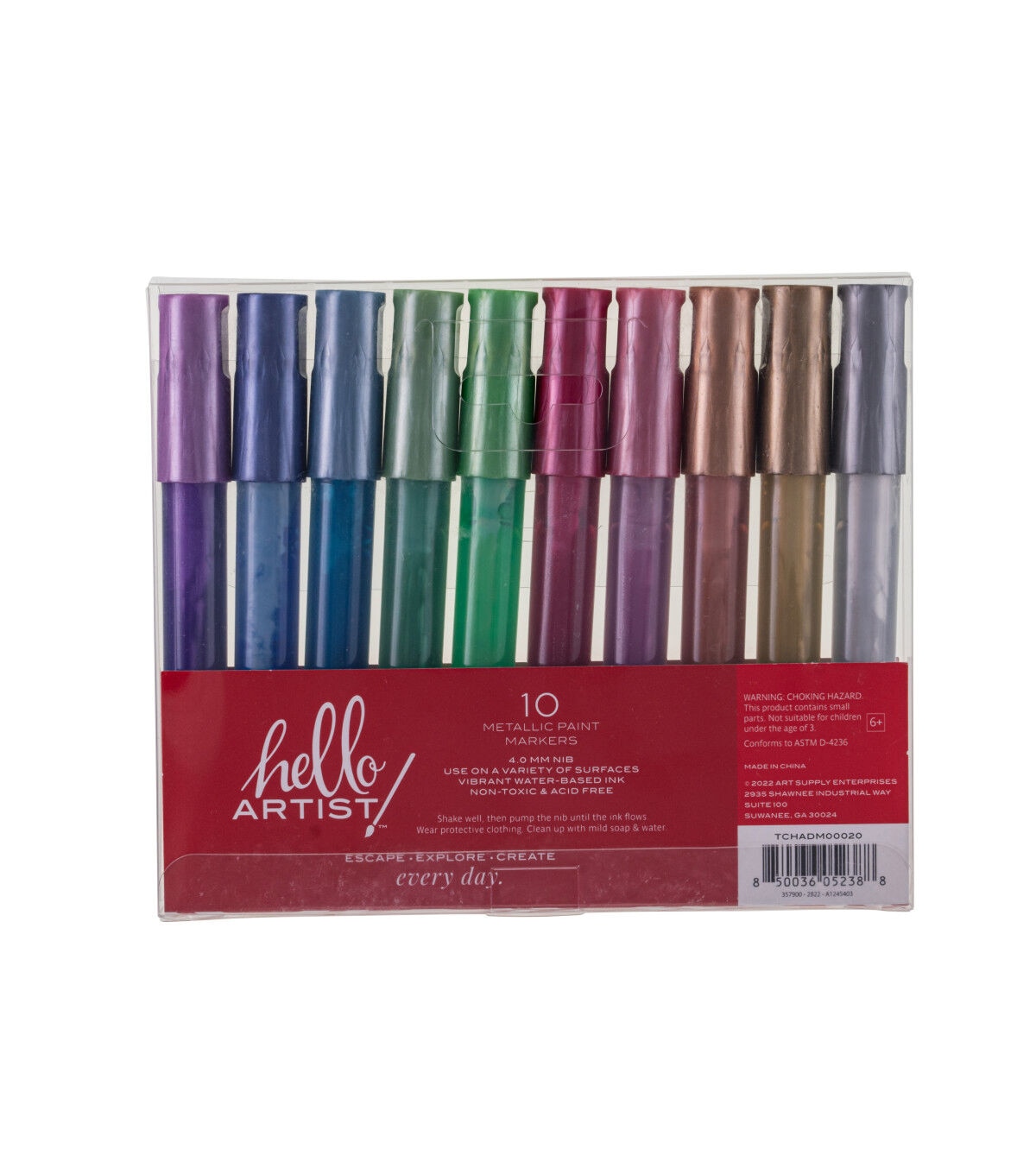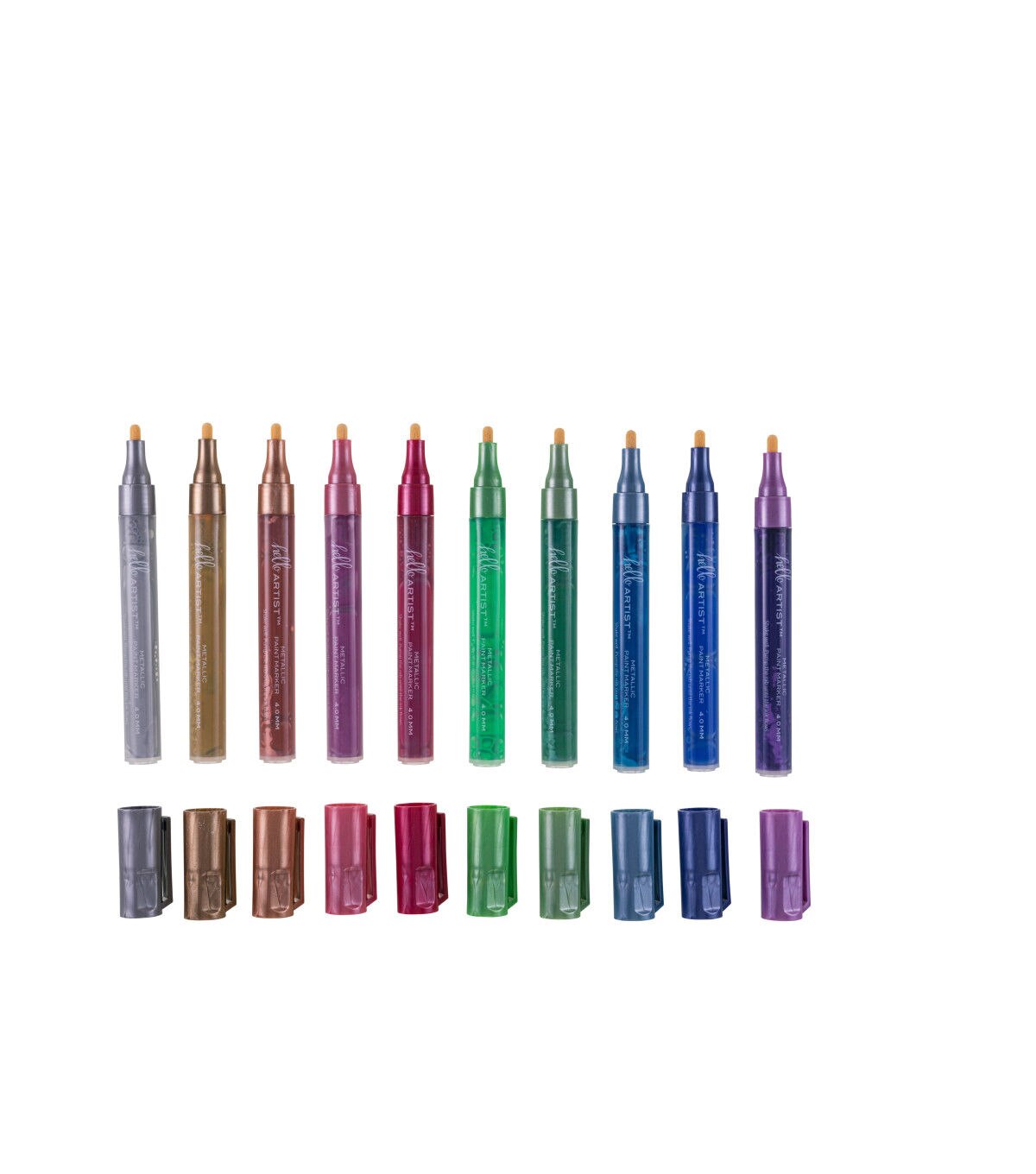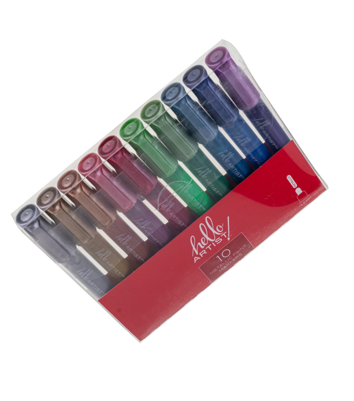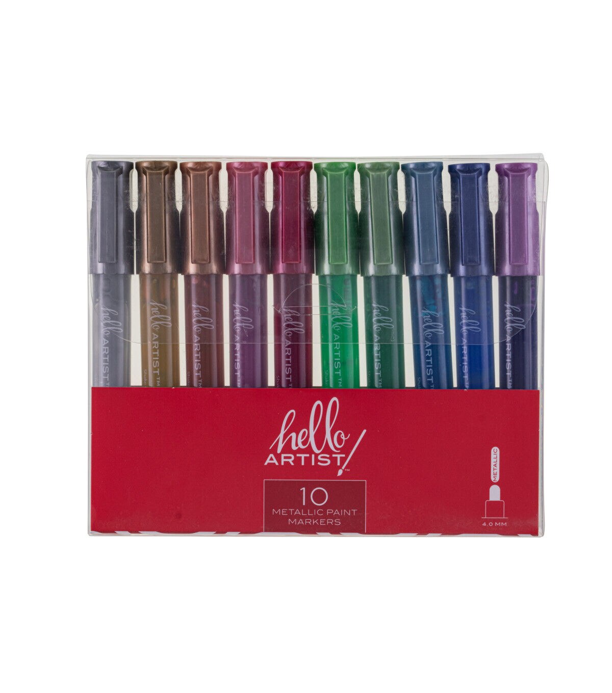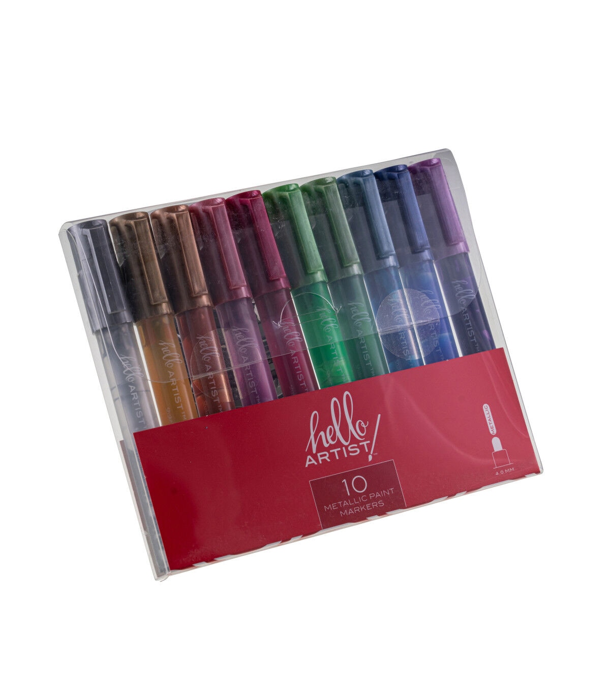This set of Metallic Paint Markers from Hello, Artist! features 10 markers. They have a round barrel and the ink is waterbased. They can be used on wood, canvas, fabric, acrylic, metal, skateboards, rocks, and more!
