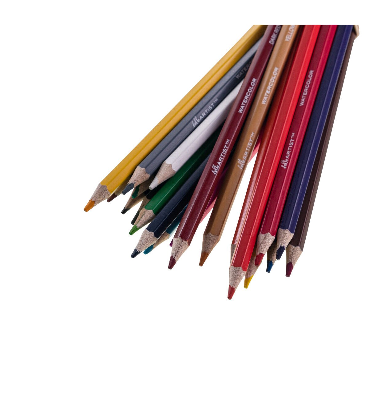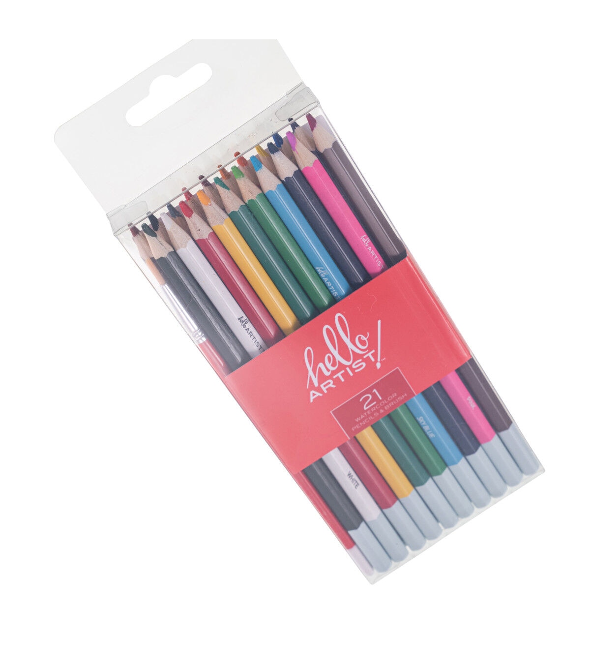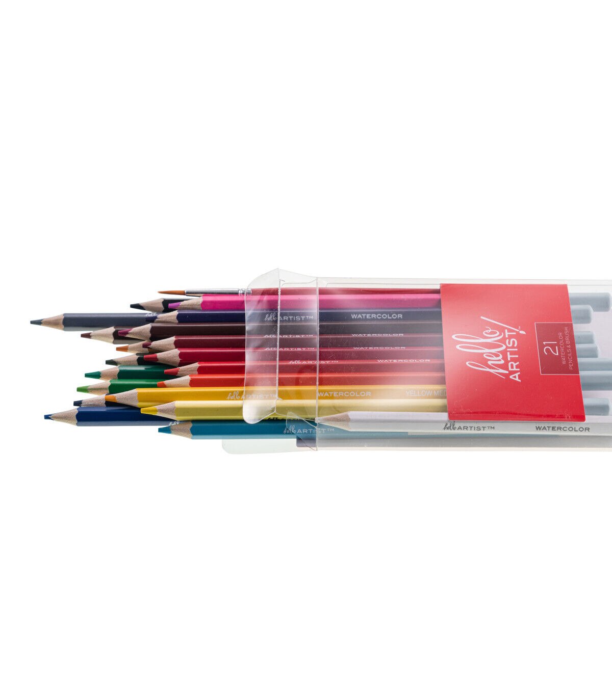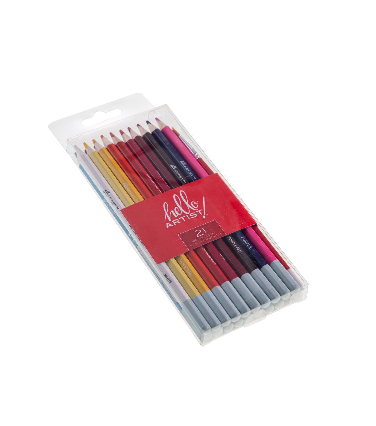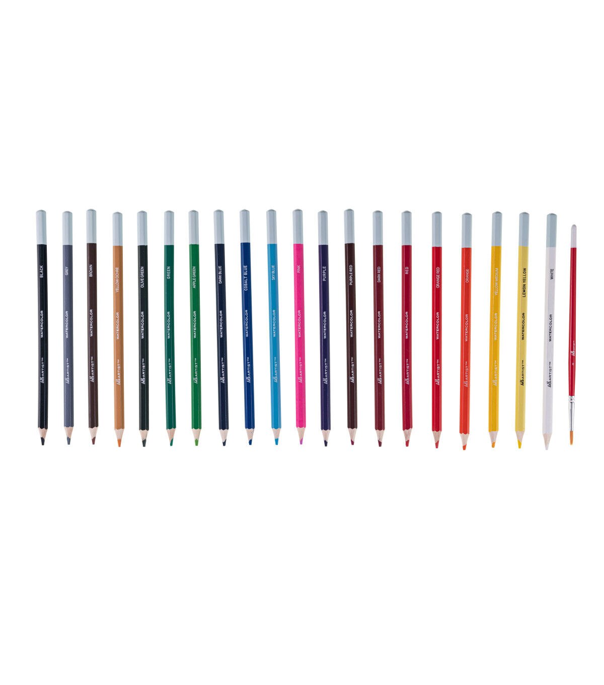 This set of Hello, Artist! Watercolor Pencils features 20 pre-sharpened watercolor pencils and 1 brush. It contains the colors white, lemon yellow, yellow medium, orange, orange red, pink, red, dark red, purple red, purple, sky blue, cobalt blue, dark blue, apple green, green, olive green, yellow ochre, brown, grey, and black.