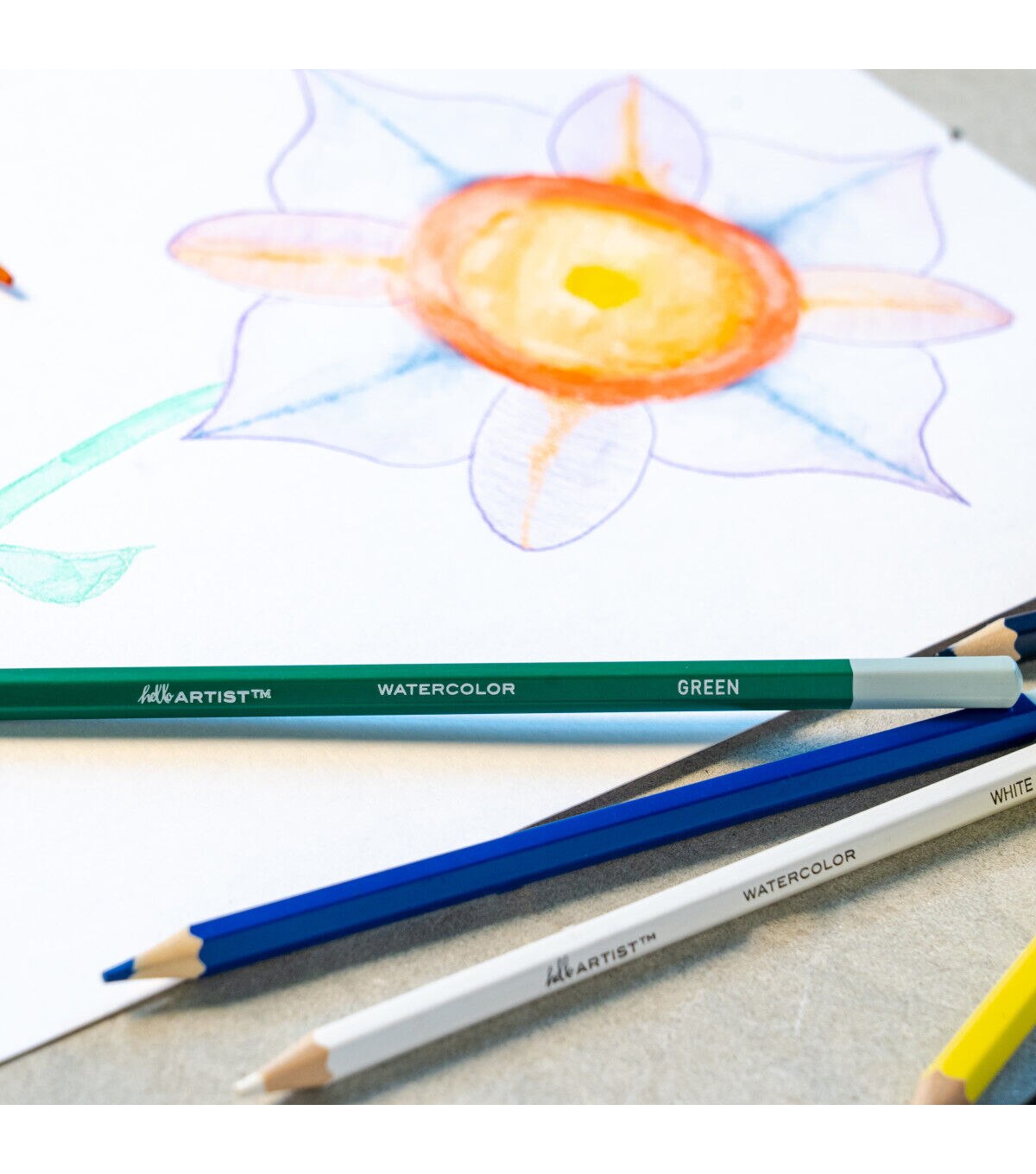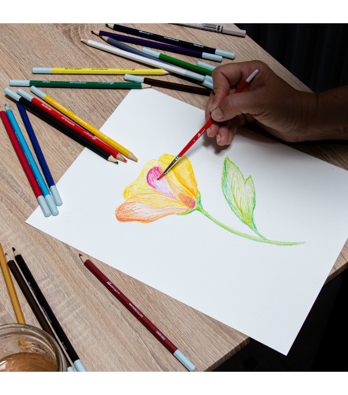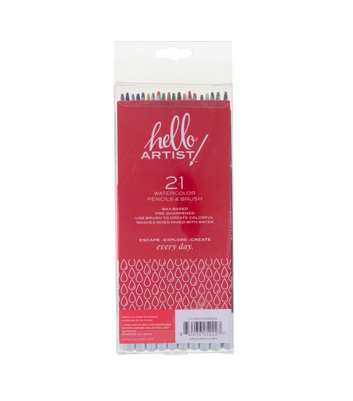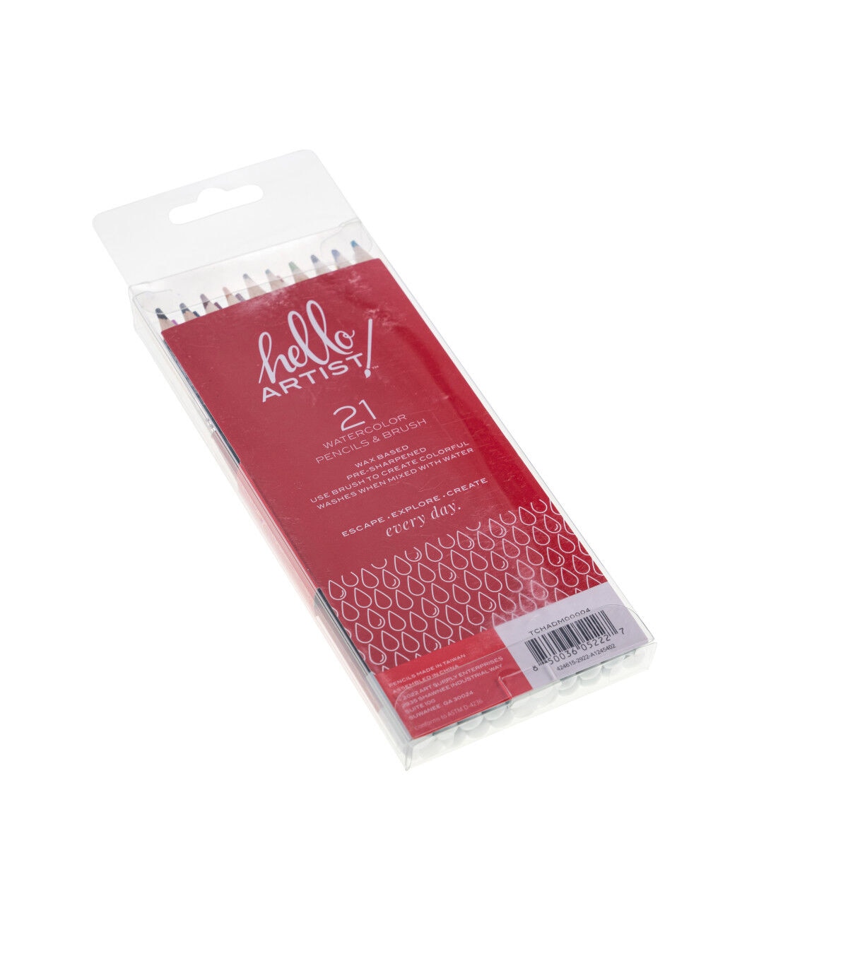 This set of Hello, Artist! Watercolor Pencils features 20 pre-sharpened watercolor pencils and 1 brush. It contains the colors white, lemon yellow, yellow medium, orange, orange red, pink, red, dark red, purple red, purple, sky blue, cobalt blue, dark blue, apple green, green, olive green, yellow ochre, brown, grey, and black.