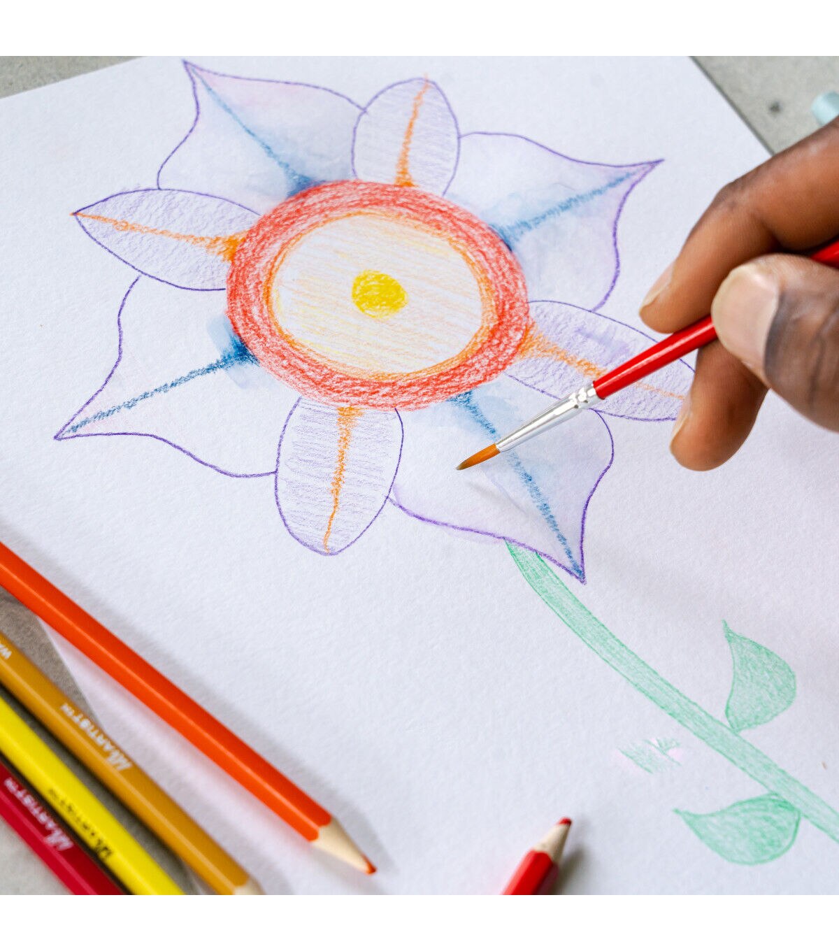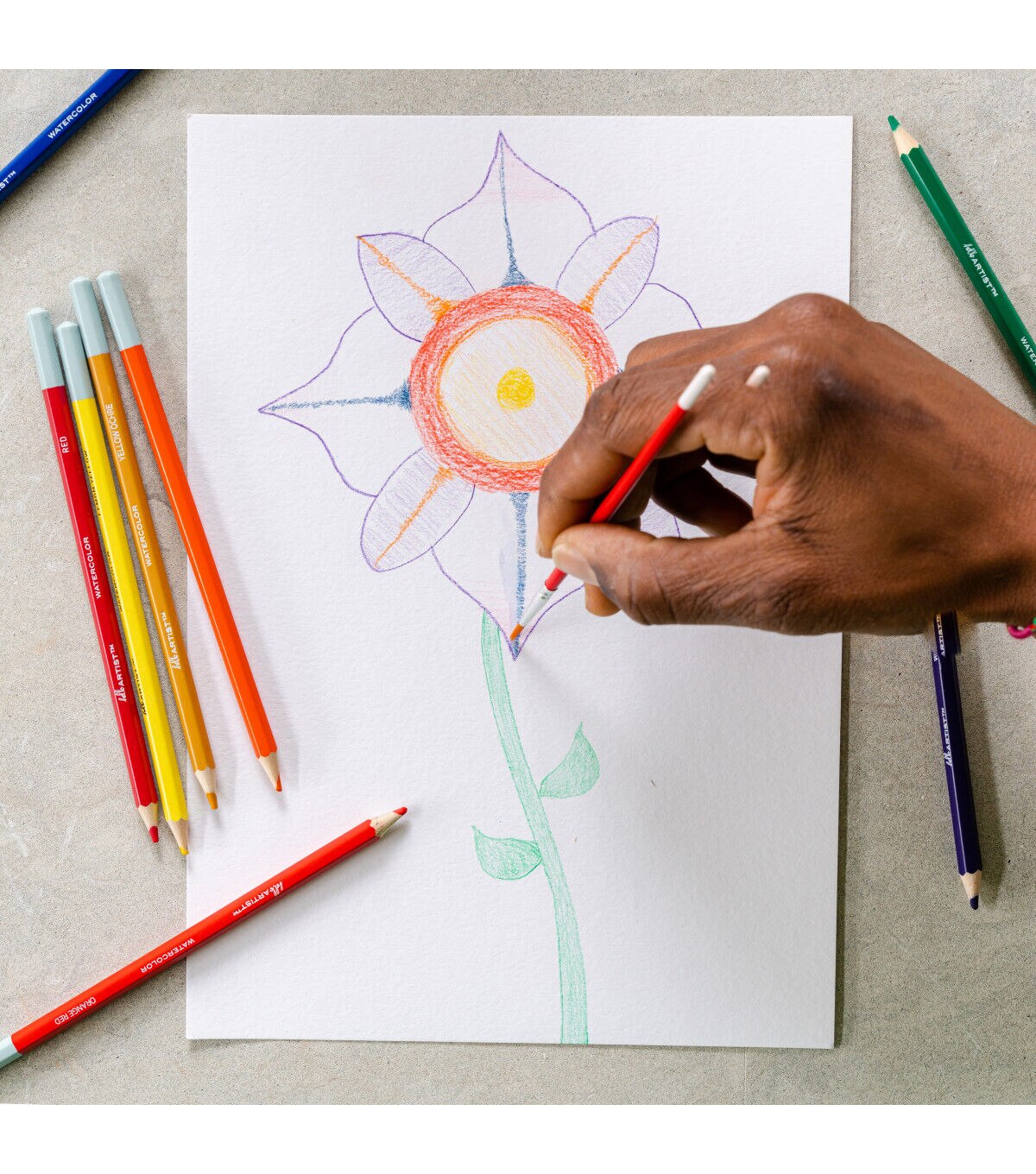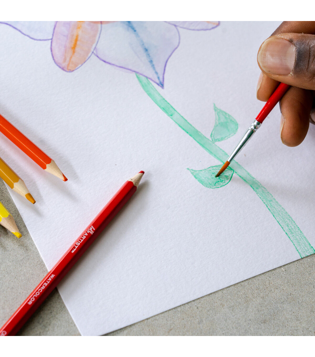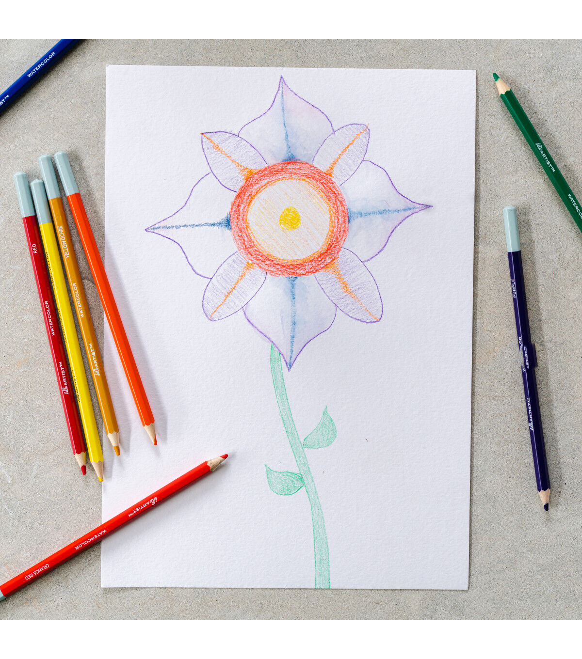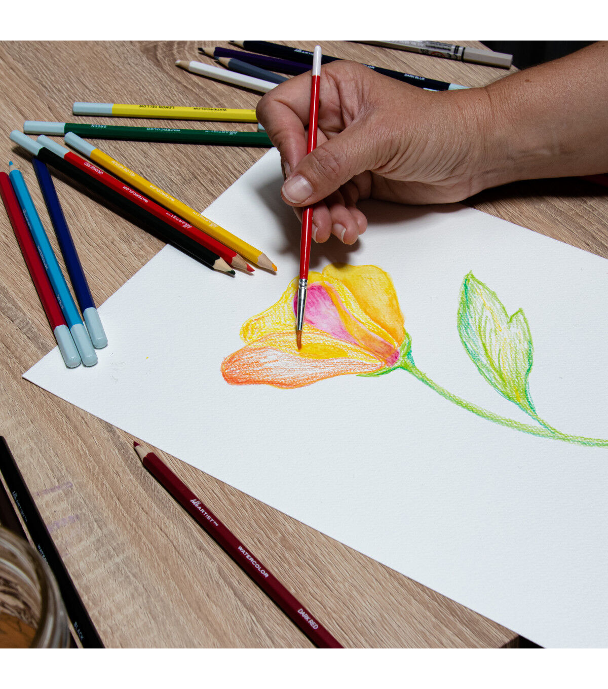 This set of Hello, Artist! Watercolor Pencils features 20 pre-sharpened watercolor pencils and 1 brush. It contains the colors white, lemon yellow, yellow medium, orange, orange red, pink, red, dark red, purple red, purple, sky blue, cobalt blue, dark blue, apple green, green, olive green, yellow ochre, brown, grey, and black.