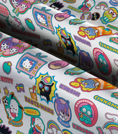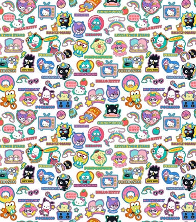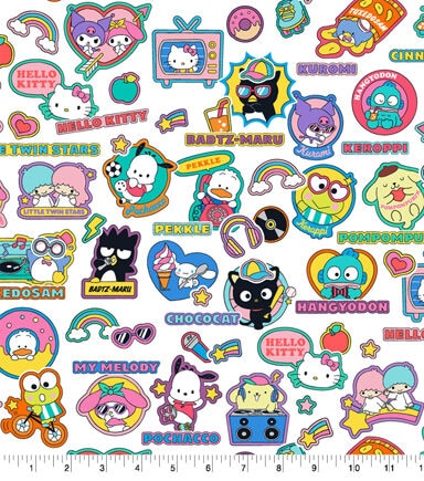 This Hello Kitty and Friends Stickers is 100% cotton with all of your favorite characters such as Hello Kitty, Pachacoo, Pekkle, Chococat, Hangyodon, Pompompurin, and Badtz-Maru. This fabric would be great for a throw blanket or pillow covers.