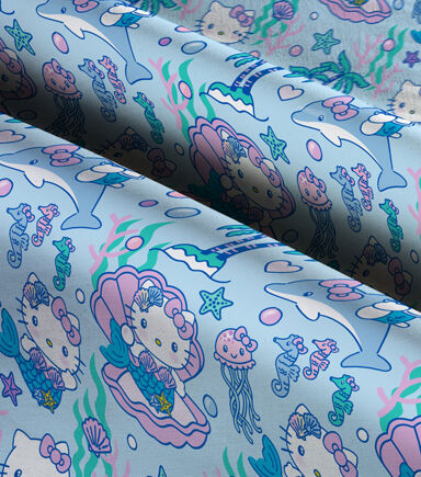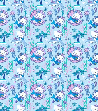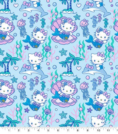 This super cute Hello Kitty Mermaid cotton fabric is covered with Hello Kitty Mermaid, dolphines, starfish, seahorses and jellyfish. This design has a lot of pinks, purples, and blues. This fabric would be perfect for the Hello kitty or mermaid fan to craft a throw blanket or a bag to take to the beach!