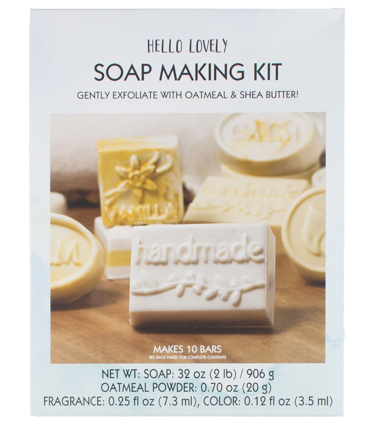 The Hello Lovely Soap Making Kit-Oatmeal allows you to make handmade soaps to gently exfoliate your skin. The soap comprises a mix of finely ground oatmeal and creamy shea butter topped with a hint of soothing creamy vanilla fragrance. Make 10 soap bars using this kit.