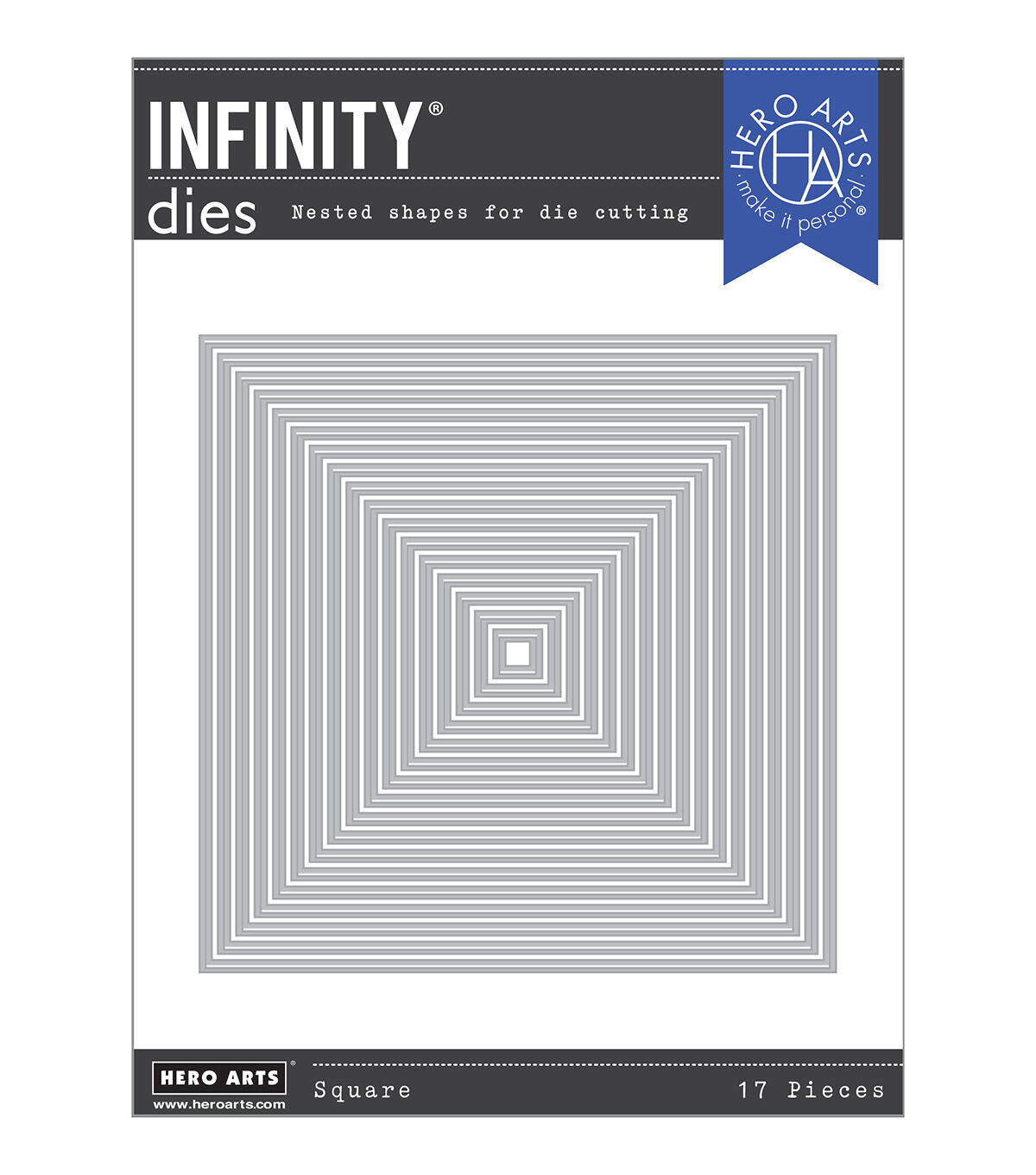 Hero Arts Infinity Dies offer a generous variety of sizes around a specific cutting theme. Nesting die sets allow you to add architectural form and tidy framing to your cardmaking, stamping projects, and more. Universally compatible, they are engineered from solid metal construction with a sharp and durable cutting edge. Die set contains 17 dies. ranging in size from 4.25" x 4.25" to 0.25" x 0.25".