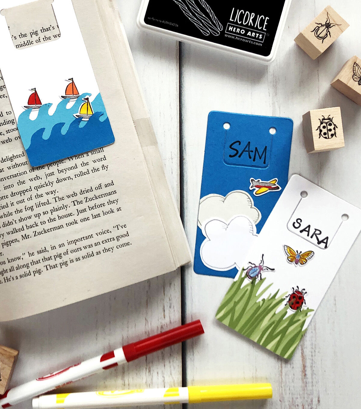Create playful cards, tags, notes and more using the Hero Arts Ink 'n Stamp Set-Bugs. Each set contains 18 fully assembled wood-mounted rubber stamps and one stamp pad. You can also use these bug rubber stamps to embellish your journals, scrapbooks, banners and more.