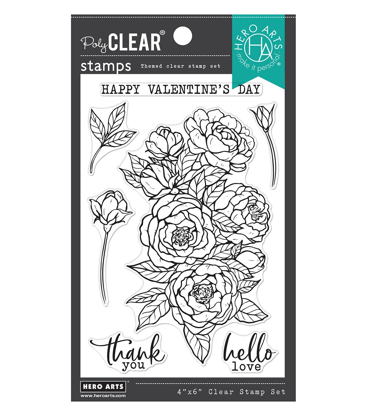 A perennial favorite of flower lovers, these peonies are lush and so detailed you can almost smell the gorgeous fragrance. With three classic sentiments, two single buds, and a leaf spray, this set is ideal for Valentine's Day, Mother's Day, and every day. Combine with SA190 Color Layering Peonies Bunch Stencils to make coloring a breeze! Peony cluster measures approximately 5.125" x 3.125", "Happy Valentine's Day" message 3.25" x 0.25". Hero Arts 4” x 6” clear stamp sets offer the best quality in the market. They are made in the USA from genuine photopolymer which is non-toxic, biodegradable, and beautifully transfers ink to paper for a true impression every time. Peel the stamp from its backing and stick to an acrylic block for easy positioning. Mix and match the designs. Cleans up easily with water or stamp cleaner.