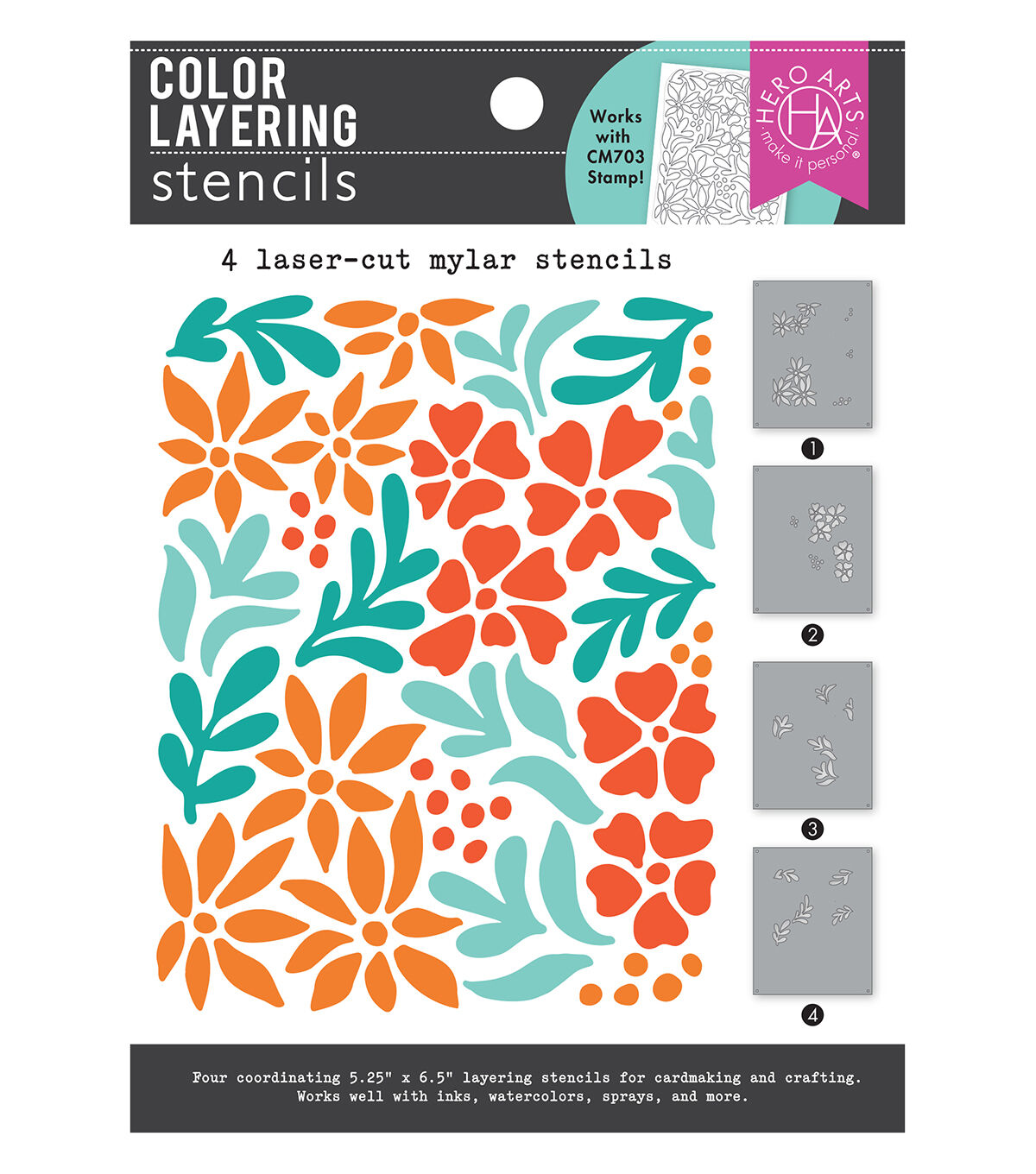 This set of four stencils creates a gorgeous bold floral pattern. Use alone or pair the stencils with CM703 Hero Arts Day Flowers Stamp Set. So many color combinations are possible to bring these flowers to life. Create rich overlapping layers in endless color combinations with our Color Layering stencil sets. Combine with coordinating stamps or dies to add more definition. Each stencil has alignment markers for ease of use. Hero Arts stencils are made of thick frosted mylar with premium laser-cut images. Use a paintbrush, ink pad, dauber, or spray to leave a stylish impression.