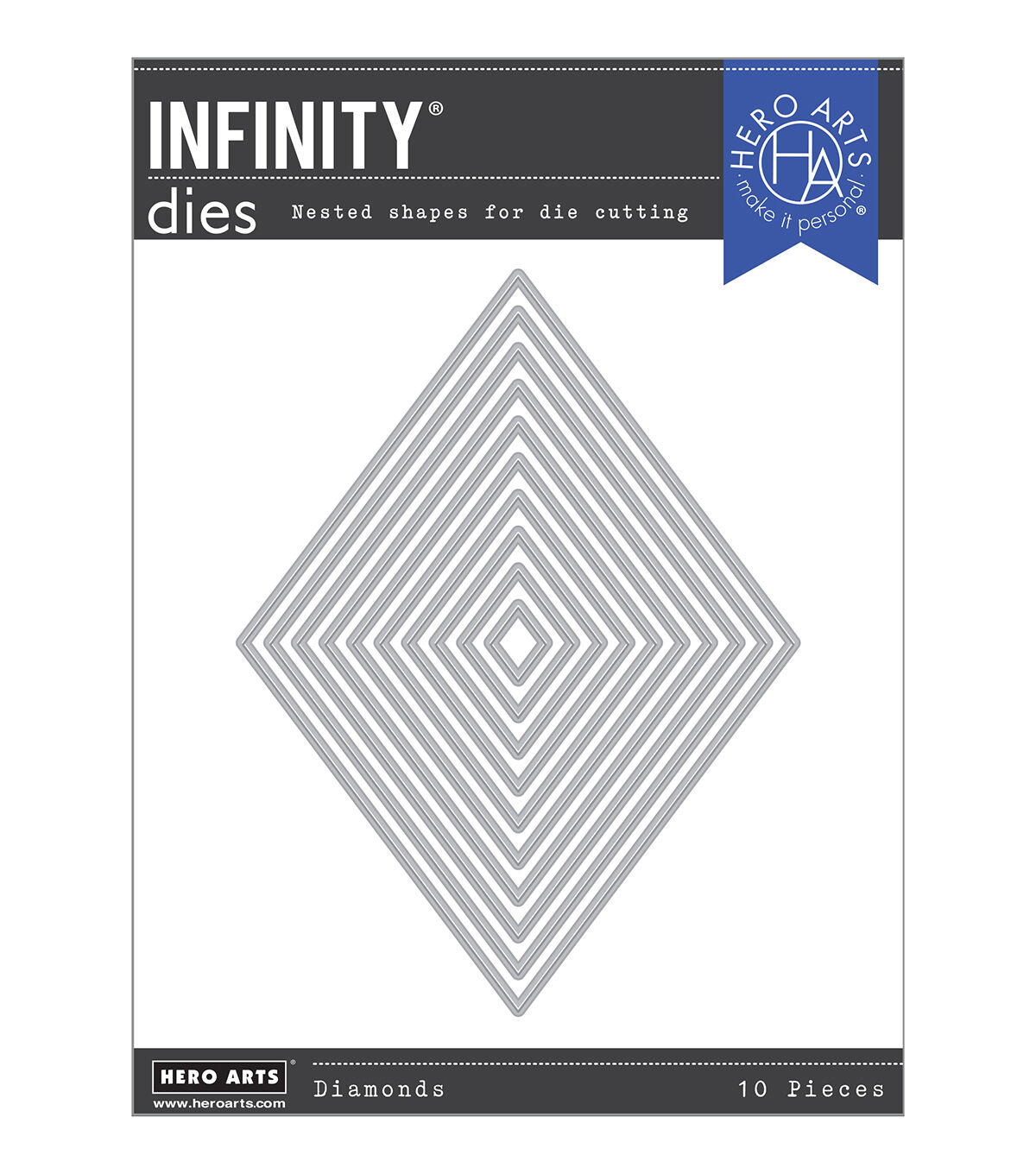 Diamond Infinity Dies will be your new favorite die set to add dimension and visual interest to your cards and papercrafting projects. This set features ten diamond-shaped dies, with the largest measuring 3.5" x 5". Hero Arts Infinity Dies offer a generous variety of sizes around a specific cutting theme. Nesting die sets allow you to add architectural form and tidy framing to your cardmaking, stamping projects, and more. Universally compatible, they are engineered from solid metal construction with a sharp and durable cutting edge.