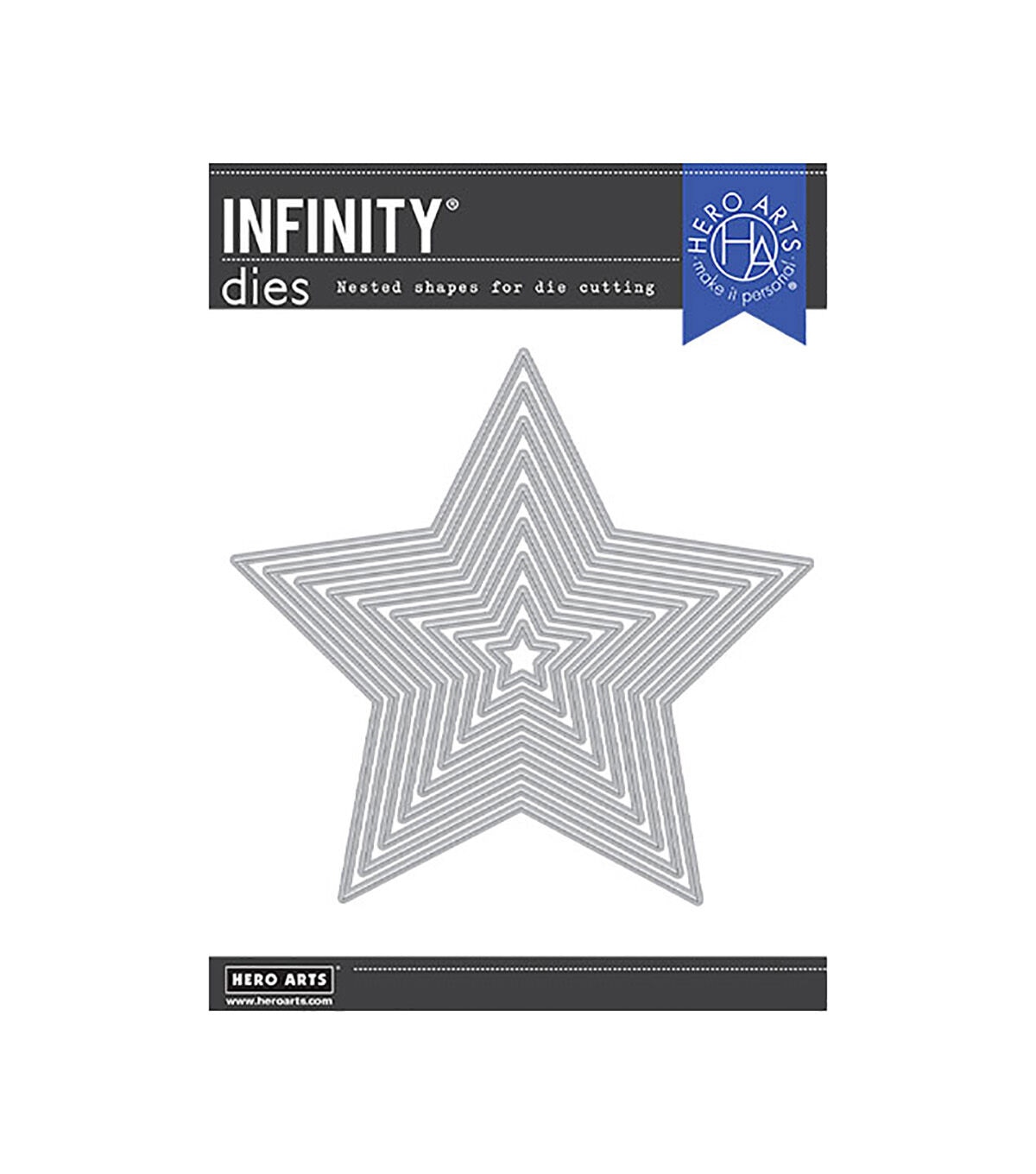 This set of Infinity Dies contains nine star dies in all, ranging from 0.5" x 0.5" to 4.5" x 4.275". Use with cardstock, felt, and more! Hero Arts Infinity Dies offer a generous variety of sizes around a specific cutting theme. Nesting die sets allow you to add architectural form and tidy framing to your cardmaking, stamping projects, and more. Universally compatible, they are engineered from solid metal construction with a sharp and durable cutting edge.