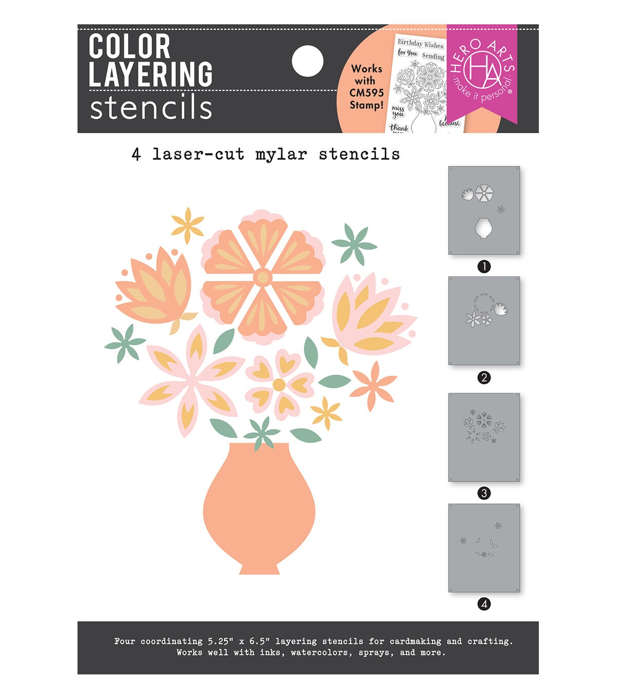 Create a beautiful bouquet without stamping. This color layering stencil set features a lush floral arrangement in a vase. Use it alone for a softer, more abstract look or in combination with CM595 Hero Arts Flowers in Vase stamp set for a more finely detailed image. The outer edge of these stencils measures 5.25″ x 6.5″. Create rich overlapping layers in endless color combinations with our Color Layering stencil sets. Combine with coordinating stamps or dies to add more definition. Each stencil has alignment markers for ease of use. Hero Arts stencils are made of thick frosted mylar with premium laser-cut images. Use a paintbrush, ink pad, dauber, or spray to leave a stylish impression.