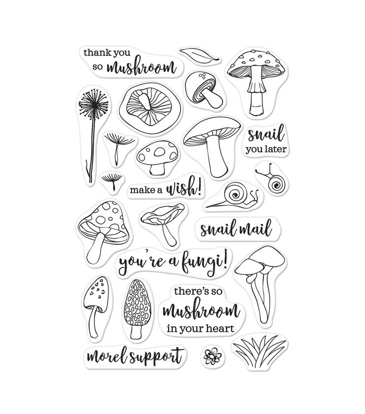 Hero Arts 4"x6" clear stamp sets offer the best quality in the market. They are made in the USA from genuine photopolymer, which is non-toxic, biodegradable, and designed specifically to transfer ink to paper for a true impression every time. Peel off your stamp from its backing and stick to an acrylic block for easy positioning. Mix and match the designs, then clean with water or stamp cleaner. Venture into the deep forest and discover a world of mushrooms and other hidden arboreal gems.