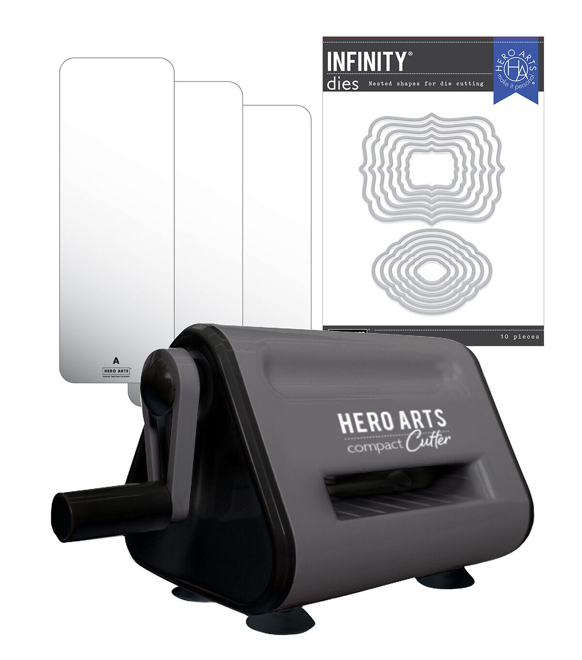 The Compact Cutter Machine is a mini die-cutting machine that features an extended 3" x 8.5" die-cutting surface. It's easy to store, portable and is compatible with thin metal craft dies. The Tag Frame Infinity Dies are sized perfectly to work in this machine and are a versatile shape great for cards, scrapbooking and gift tags. This die-cutting bundle includes the Hero Tools Compact Cutter, Hero Tools Compact Cutting Plates and the Hero Arts Tag Frames Infinity Dies.