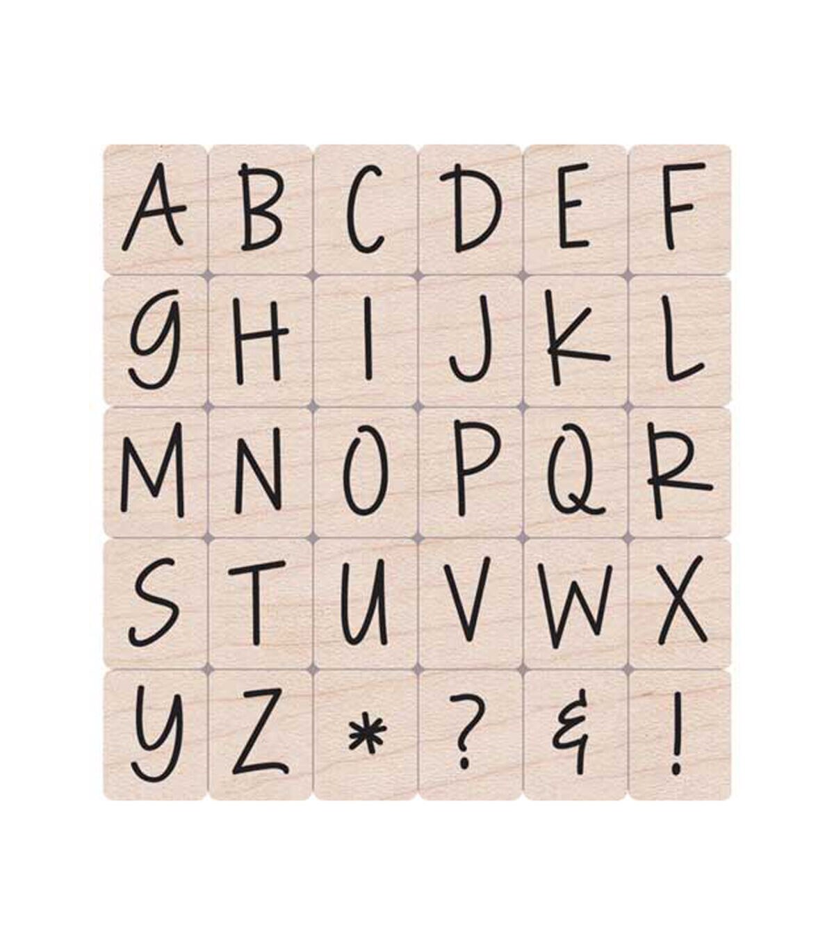 HERO ARTS-Mounted Rubber Stamp Set. Quickly and easily add inked images to your paper crafting project with this stamp set. This 3-1/4x3-1/4x1-1/4 inch package contains thirty woodblock rubber stamps. Design: Happy Upper Case Alphabets. Made in USA.