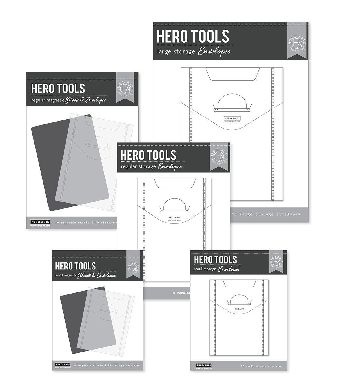 Get organized with the Hero Arts Stamp & Die Storage system! These high quality transparent plastic storage envelopes are perfect for storing clear and cling stamps. The magnetic sheets keep your metal dies securely organized. The stamp storage bundle includes one box each of the following: Hero Tools Small Storage Envelopes 4"x5" 10ct., Hero Tools Regular Storage Envelopes 5"x7" 10ct., Hero Tools Large Storage Envelopes 7"x9" 10ct., Hero Tools Small Magnet Sheets & Storage Envelopes 10ct., and Hero Tools Regular Magnet Sheets & Storage Envelopes 10ct.