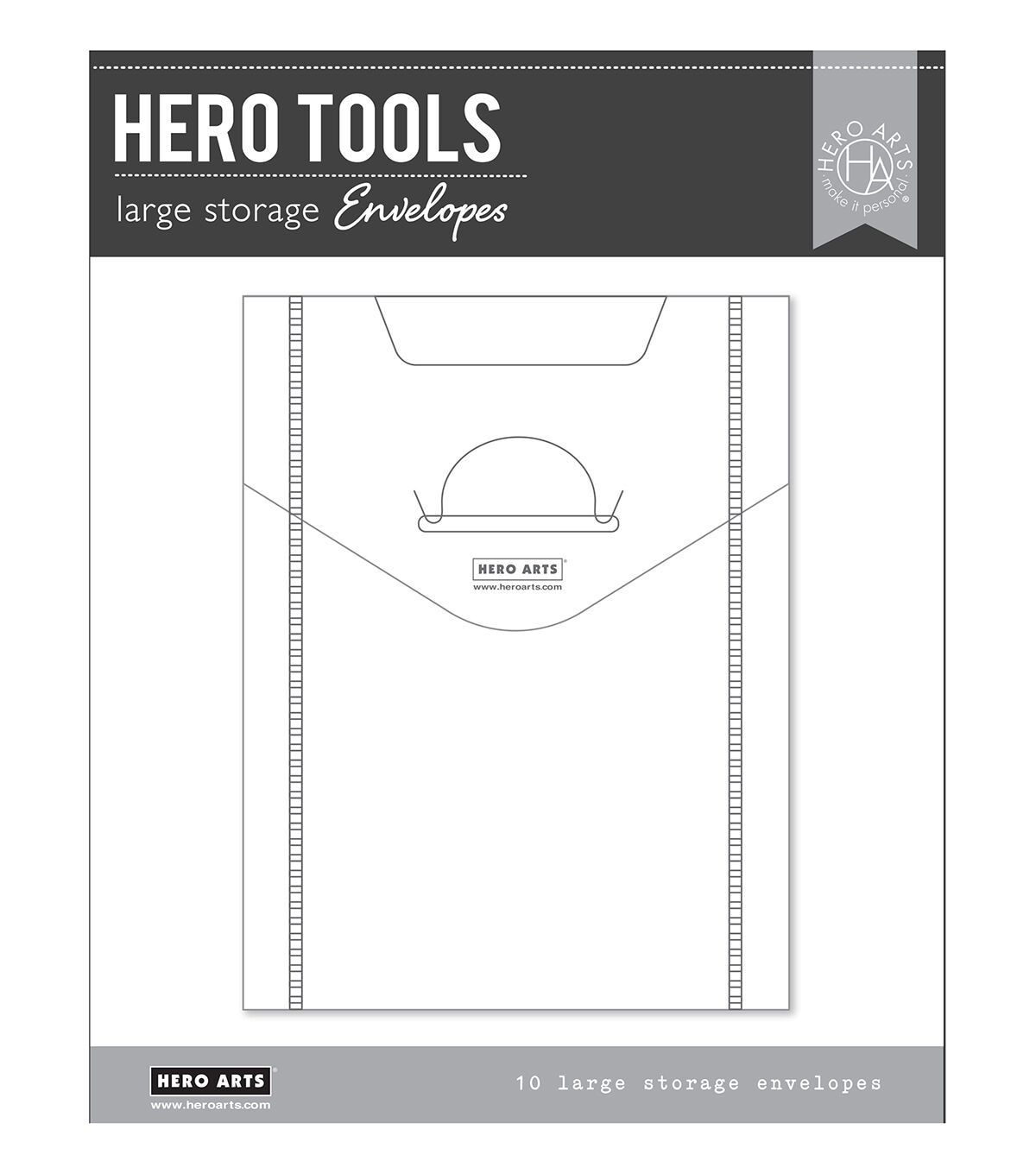 A set of envelopes ideal for storing clear or cling stamps of all sizes. Comfortably fits a 6” x 8” clear stamp set or smaller. This is an ideal way to bring organization to your craft room while protecting your stamps. Includes ten 7" x 9" transparent plastic organization envelopes, made with long-lasting, sturdy construction with a top closure. Hero Tools is a curated collection of essential tools for stamping, cardmaking, scrapbooking, and mixed media. We selected the best quality products with a classic branded look in the spirit of the Hero Arts style.