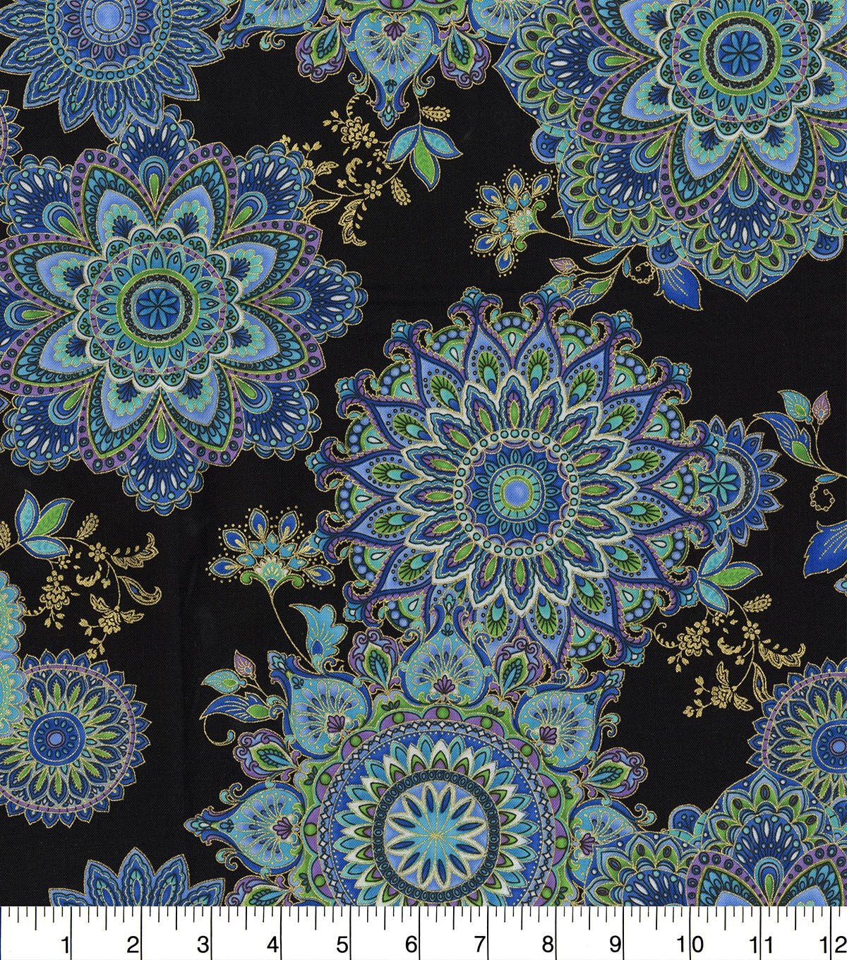 • Hi Fashion Blue Medallions On Black Premium Print Cotton Fabric