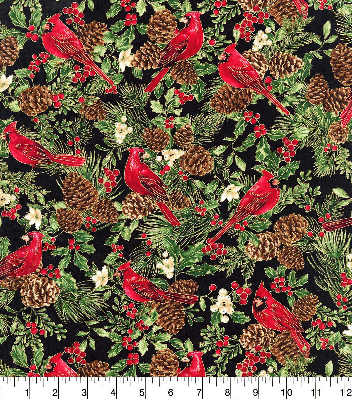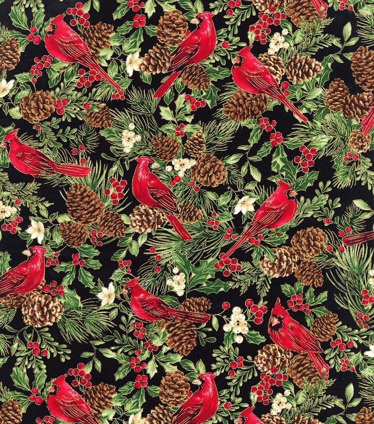 Get into the Festive Spirit with Hi Fashion Cardinals on Black Christmas Metallic Cotton Fabric