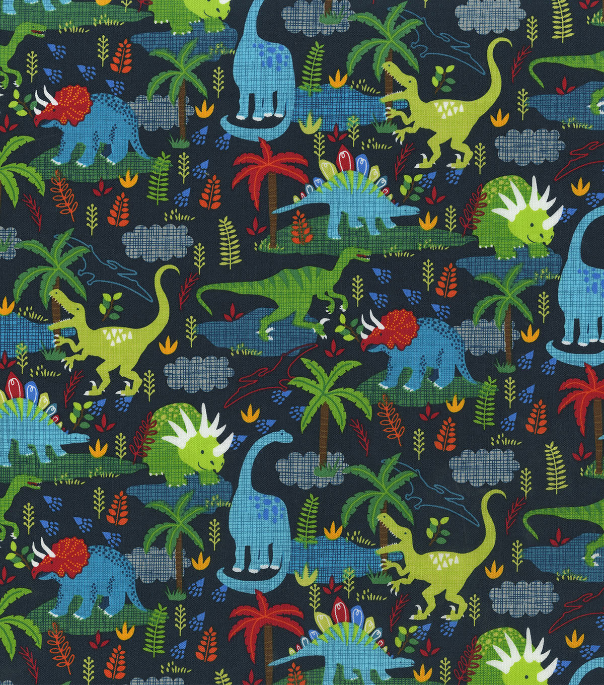 It’s a dino world out there on the Novelty Cotton Fabric-Dinos on Navy. Dinosaurs, of all kinds, moods and colors, take a stroll across the vibrant dense forest of this fabric. Sew quilting, upholstery and drapery projects and they are sure to add a ‘dino-mic’ touch to your home. Rugs, wall quilts and curtains made out of it will look attractive too.