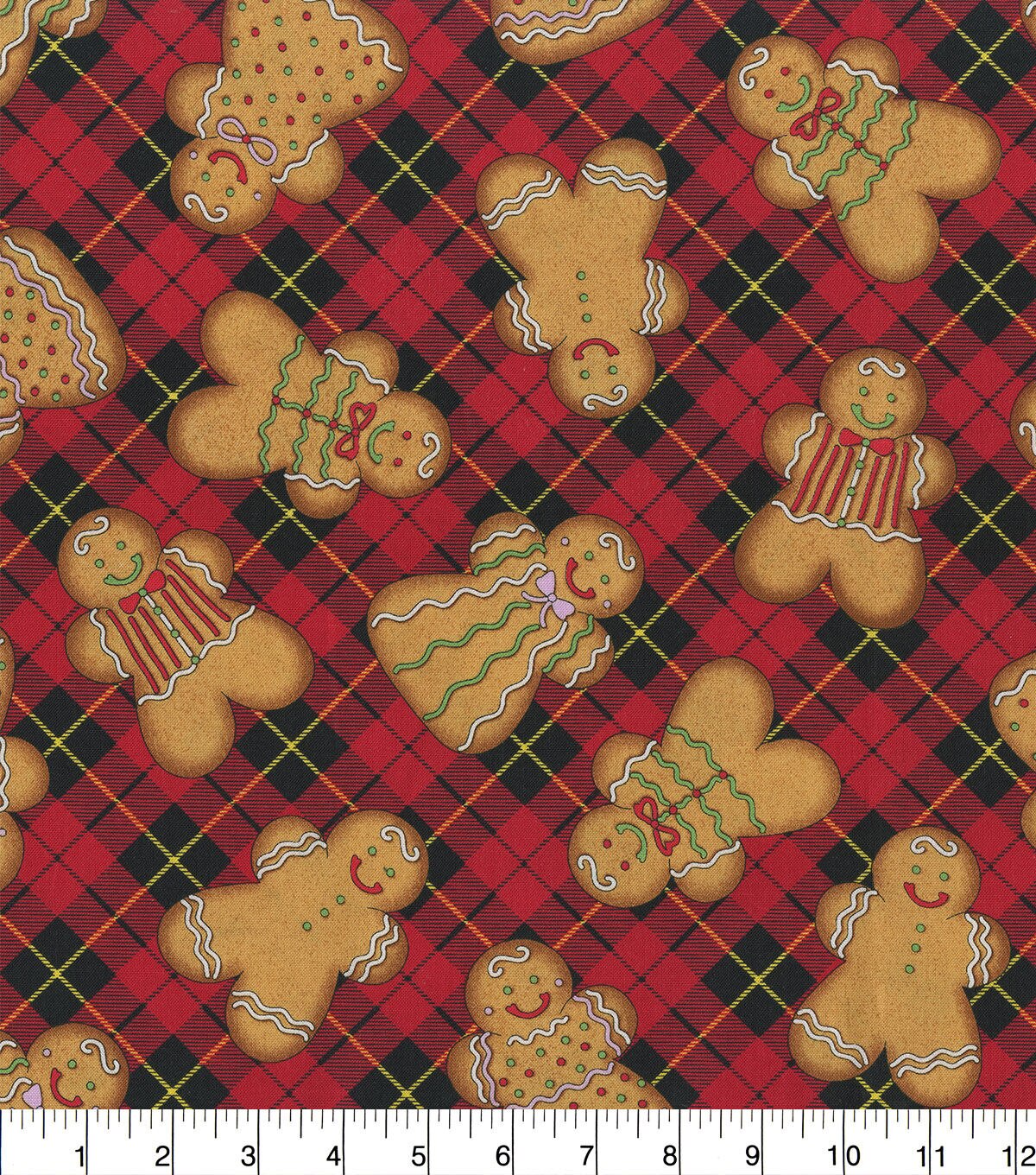 Hi Fashion Gingerbread Cookies on Plaid Christmas Cotton Fabric