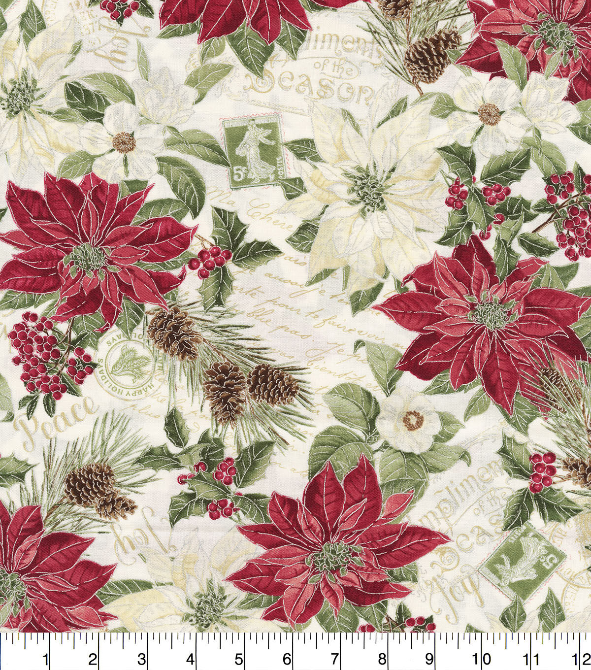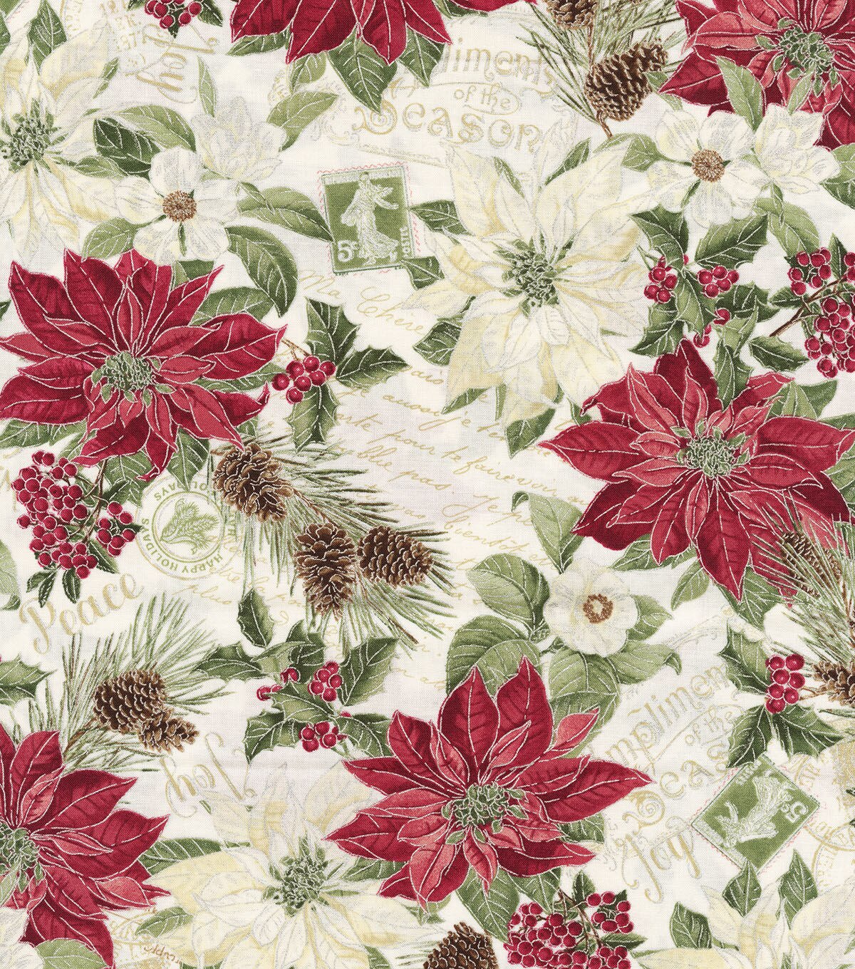 Get into the Festive Spirit with Hi Fashion Merry & Poinsettias on White Christmas Metallic Cotton Fabric