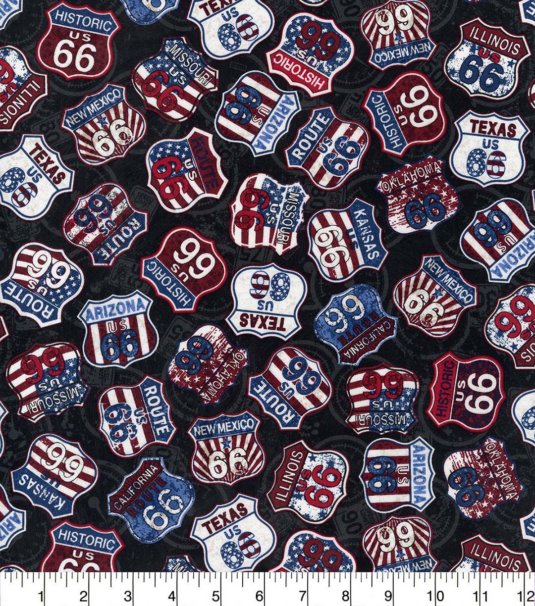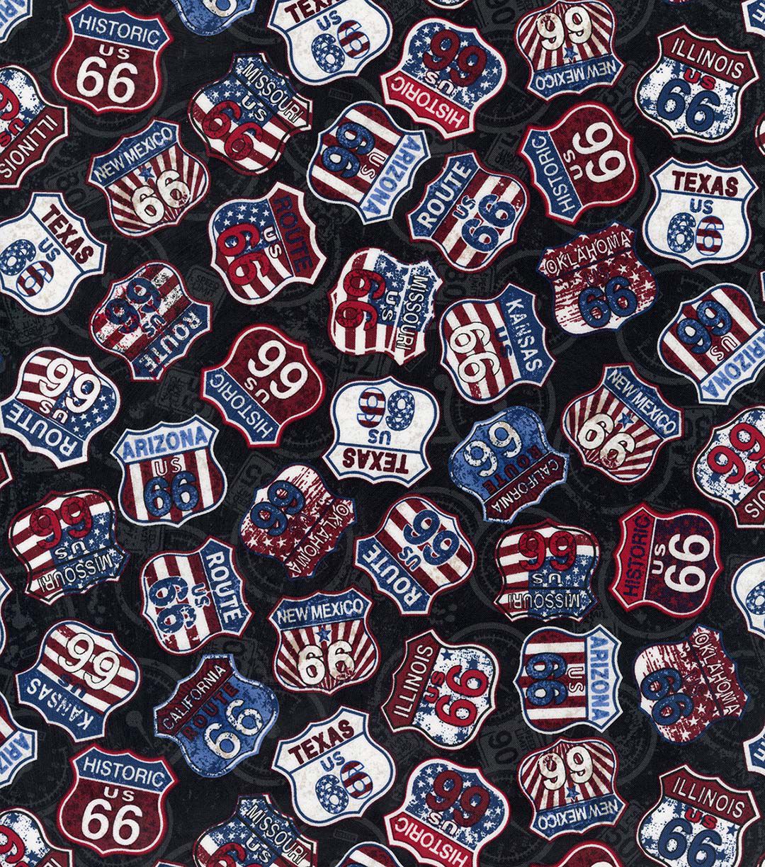 Hit the open road with this unique and eye-catching fabric featuring classic Route 66 patches on a black background. Whether you're a fan of the iconic highway or just looking for a fun and playful fabric for your next project, this 100% cotton fabric is sure to rev up your creativity.