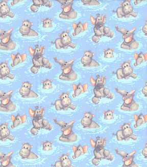 Adorable Hippo Babies Playing in Water Nursery Cotton Fabric