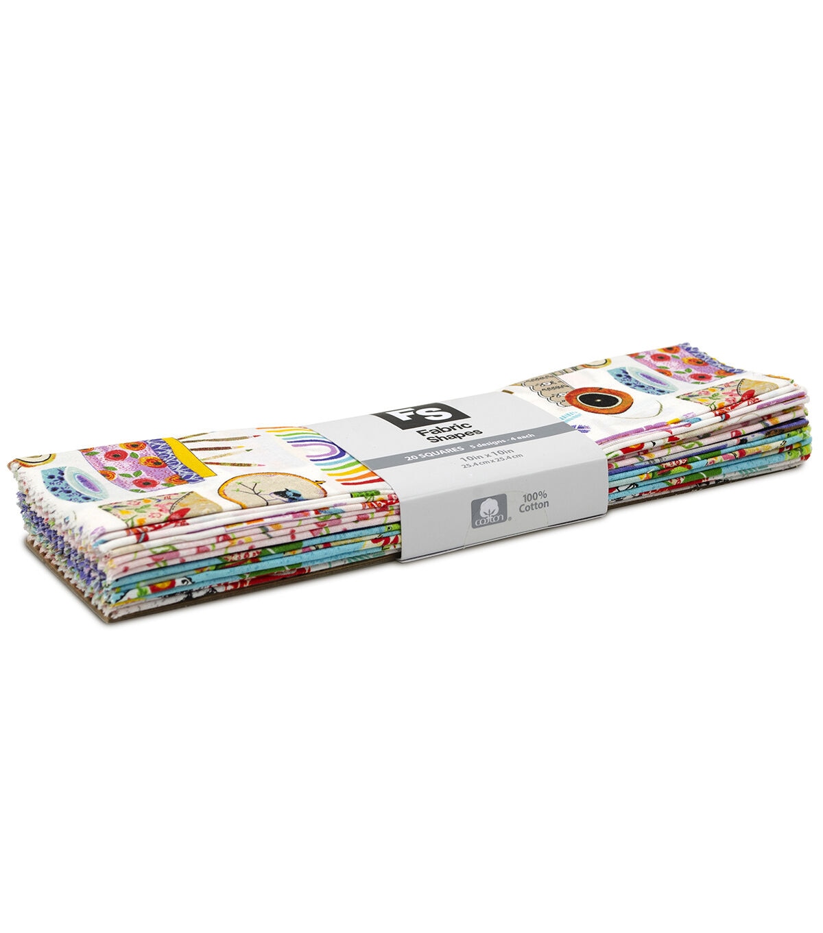 - 10"x10" Fabric Squares; Package contains 20 pieces, 4 each of 5 designs