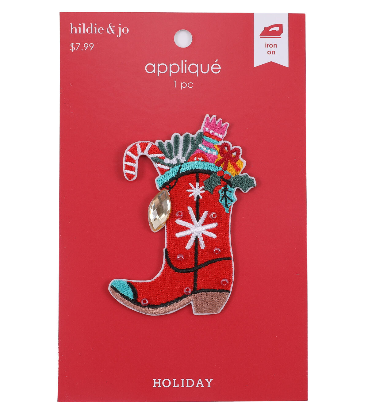 Use the Holiday Cowboy Boot Applique by hildie & jo to customize denim coats or pants. This applique is shaped like a cowboy boot that is filled with flowers. A faceted stone gives it a finishing touch. You can also team it with other fabric embellishments and beads, sold separately, to spruce up DIY craft or fabric projects.