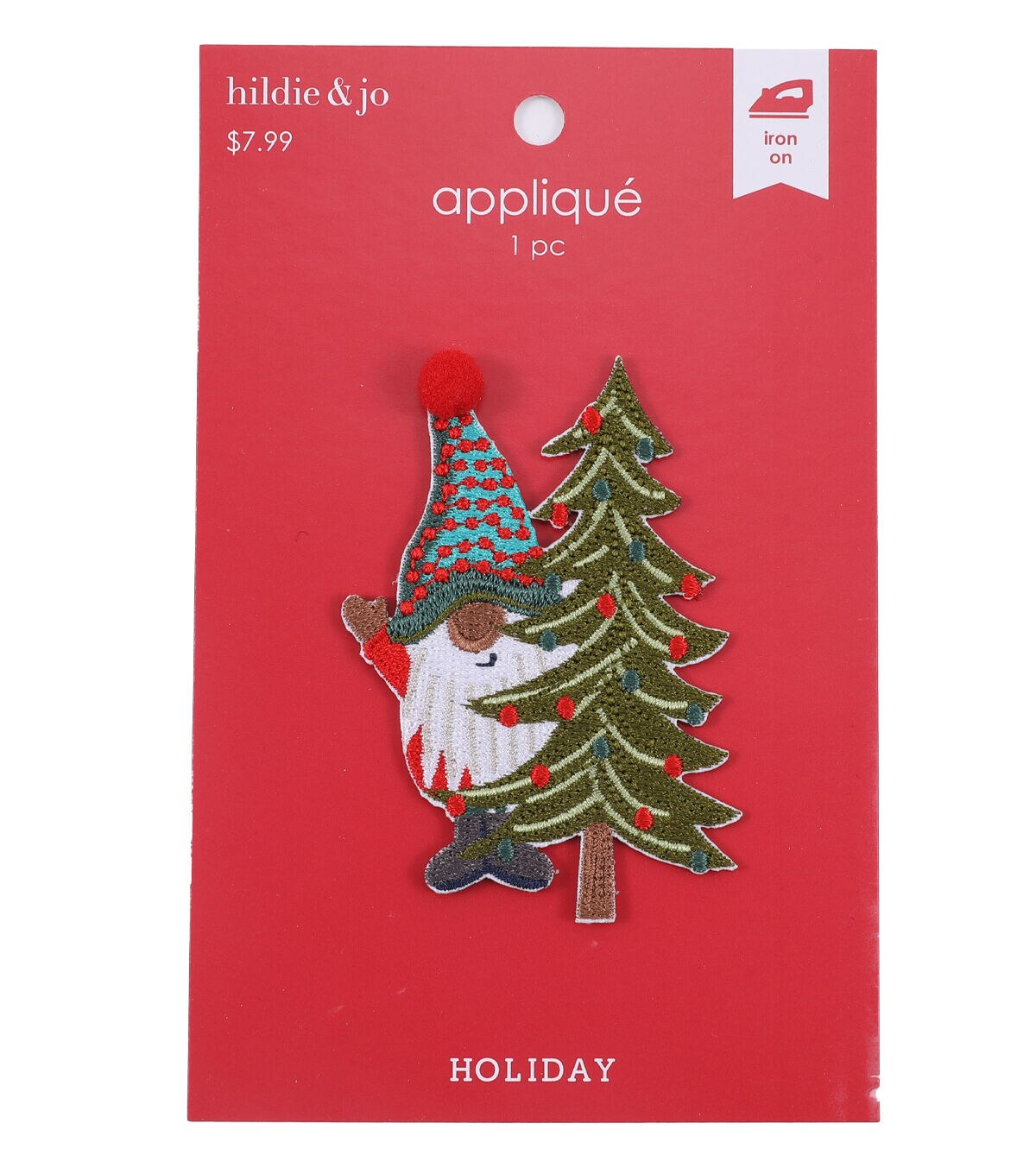 Deck up your solid tees and handbags in a jiffy with the Holiday Gnome & Tree Applique by hildie & jo. Resembling a gnome peeking from behind an embellished Christmas tree, this colorful embroidered applique is eye-catching. You can also add it to aprons and mitts by simply running a hot iron on it.