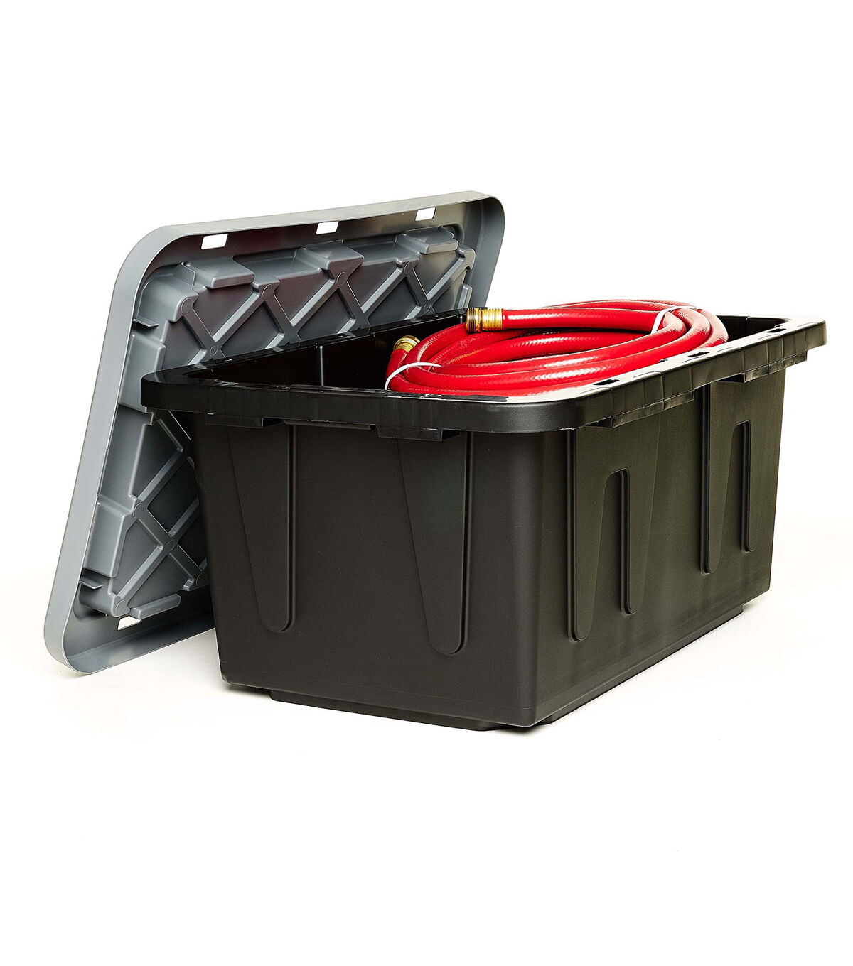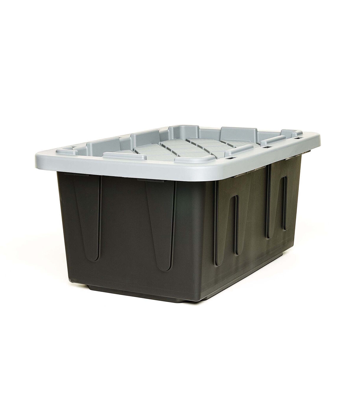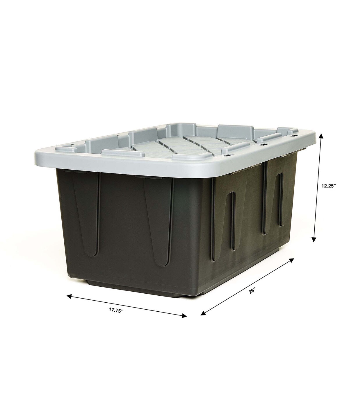 Use the Plastic Durabilt Heavy Duty Storage Tote with Lid - Black & Gray to preserve keepsakes, trinkets or holiday ornaments over the years. This storage tote sports a black hue and comes with a gray, heavy-duty lid. Elevated tie-down dividers and six clasps on the lid provide secure storage. It is made from a shatter-proof material that is resistant to blemishes and dents.