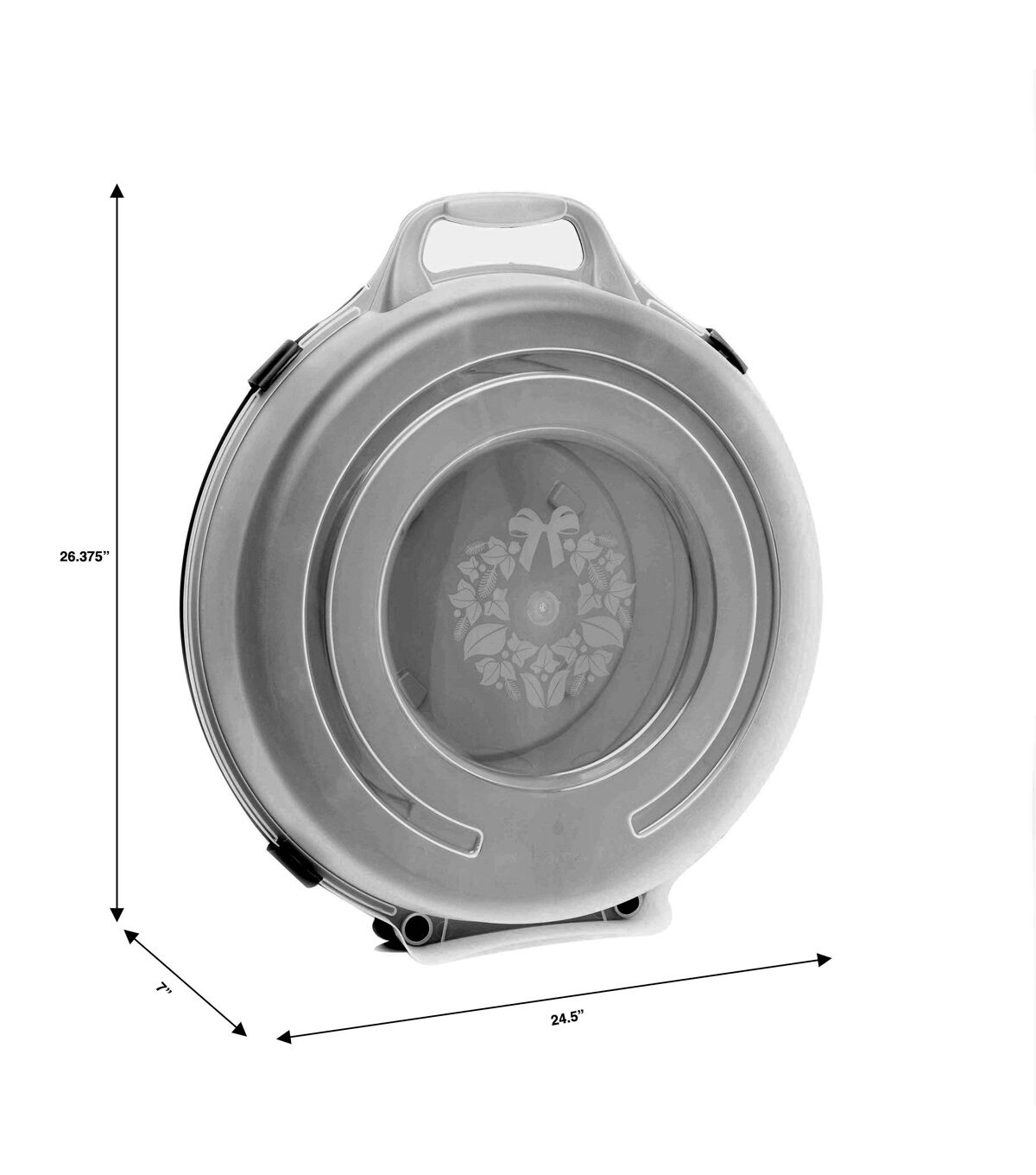 Homz is here to help with your everyday festive wreath storage! The wreath storage box will keep your Christmas, spring, summer and fall wreaths as good as new year after year. It has a black base with clear lid making it easy to see the contents inside. The container will store any wreath up to 24 inches. The wreath storage box hangs, stacks or stands on its own. It is also easy to carry with a built-in handle. Lid nests in base for easy storage when not in use. Made in the USA.
