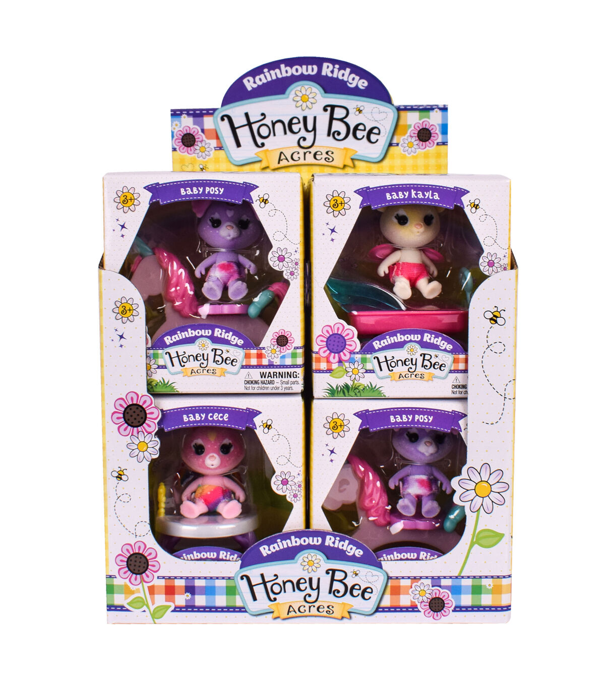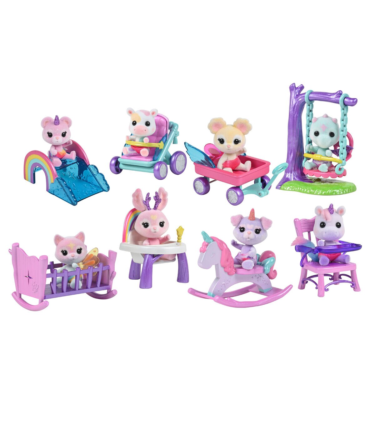 Welcome to Honey Bee Acres dollhouses, playsets, and figures where the pretend play is sweet, and the product detail is fresh and colorful! And just over the hill is a magical place where the valley sparkles and the land is as bright as a rainbow! Welcome to Rainbow Ridge! Meet the babies in Rainbow Ridge who love to play! Each poseable flocked figure wears a brightly printed diaper. Baby Kayla loves riding in her wagon, while Baby Blaze would swing all day if he could! Baby Cece’s bouncy seat is her favorite spot, and Baby Lila loves rocking back & forth in her cradle, dreaming sweet dreams. Baby Posy imagines she’s riding a real unicorn on her unicorn rocker, while Baby Benji loves riding in his fancy stroller. Baby Haley’s favorite pastime is sliding down her rainbow slide, and Baby Nico’s favorite pastime is eating rainbow cookies in his highchair! These babies are always happy, making every day a special day!