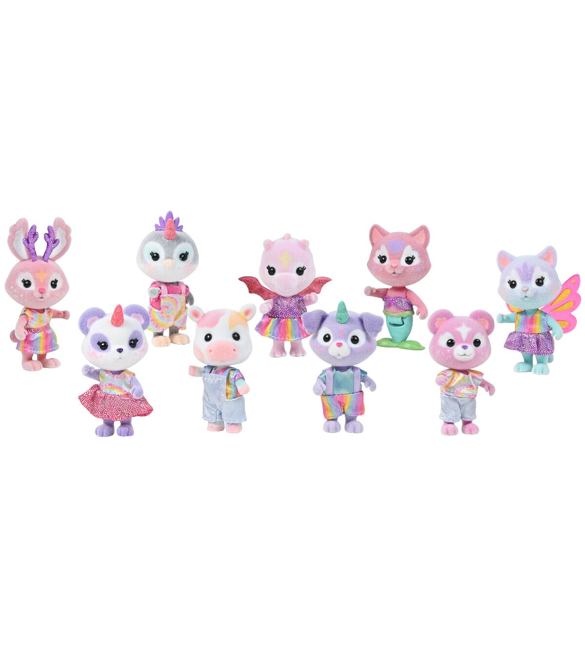 Meet the Rainbow Pals! Each posable flocked figure wears a brightly colored outfit that is removable for fun fashion play. Today the pals are playing Hide ‘n Seek. As Lucie’s counting, they all run to find hiding places. Pixie and Aura hide behind a large tree, while Luna, Levi, and Indigo hide behind the sunflowers. Mer-kitty Coral runs to the brook with Jasmine and Zeke, but she would rather swim in the water than hide! Join in the fun and create more pretend adventures together and make every day a special day!