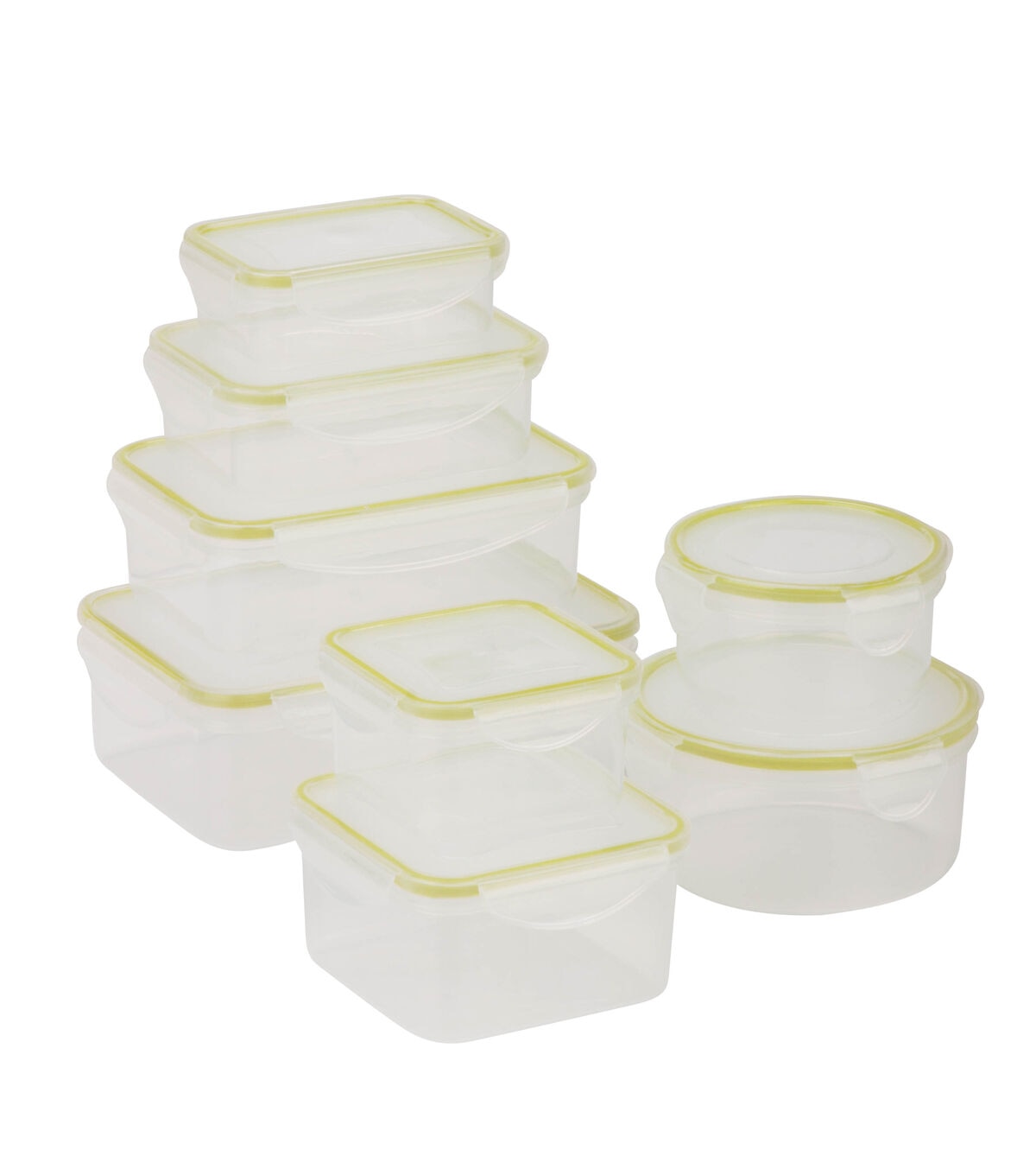 Honey-Can-Do KCH-03828 16-Piece Locking Food Container Set, Clear. This 16 piece set of food storage containers is perfect for storing leftovers, make-ahead meals and on-the-go lunches. Each container is 100 percent air and water tight. The set includes one 8-oz container, one 17-oz container, one 34-oz container, one 50-oz container, two 13-oz containers, one 23-oz container and one 30 oz container. A locking lid for each base completes the set. Dishwasher, microwave and freezer safe. When using in microwave, open closure clips on each side and open corner of lid to vent. Not for use in ovens, under broilers or on stove-top. BPA Free.