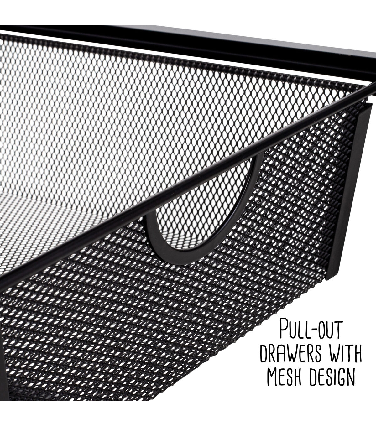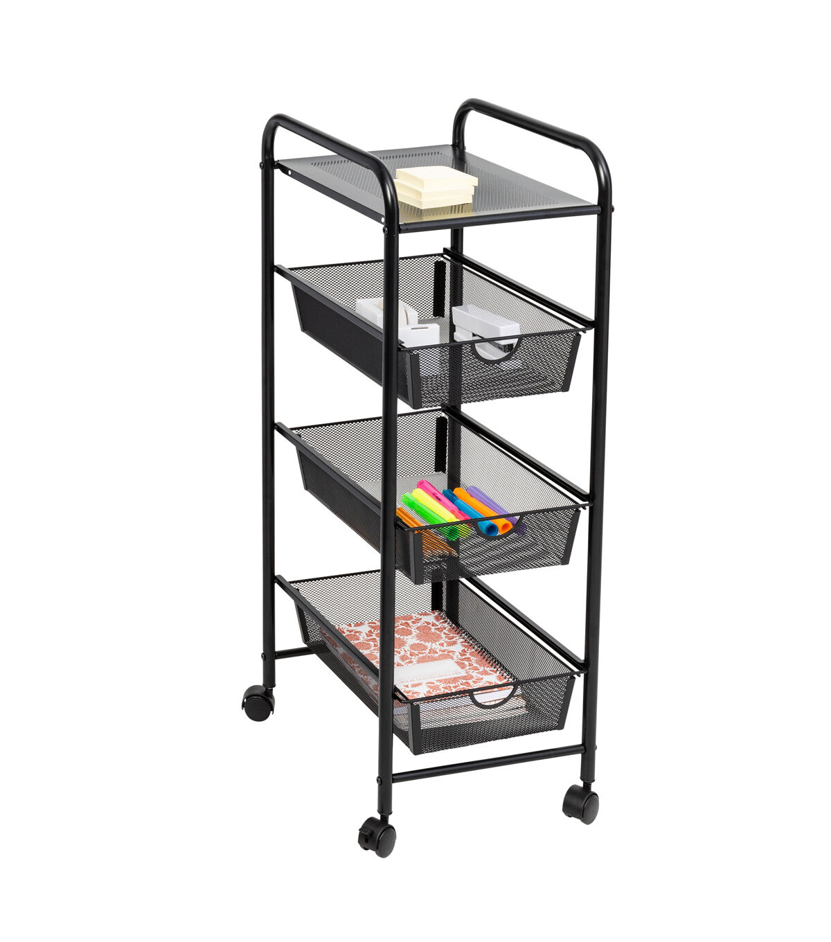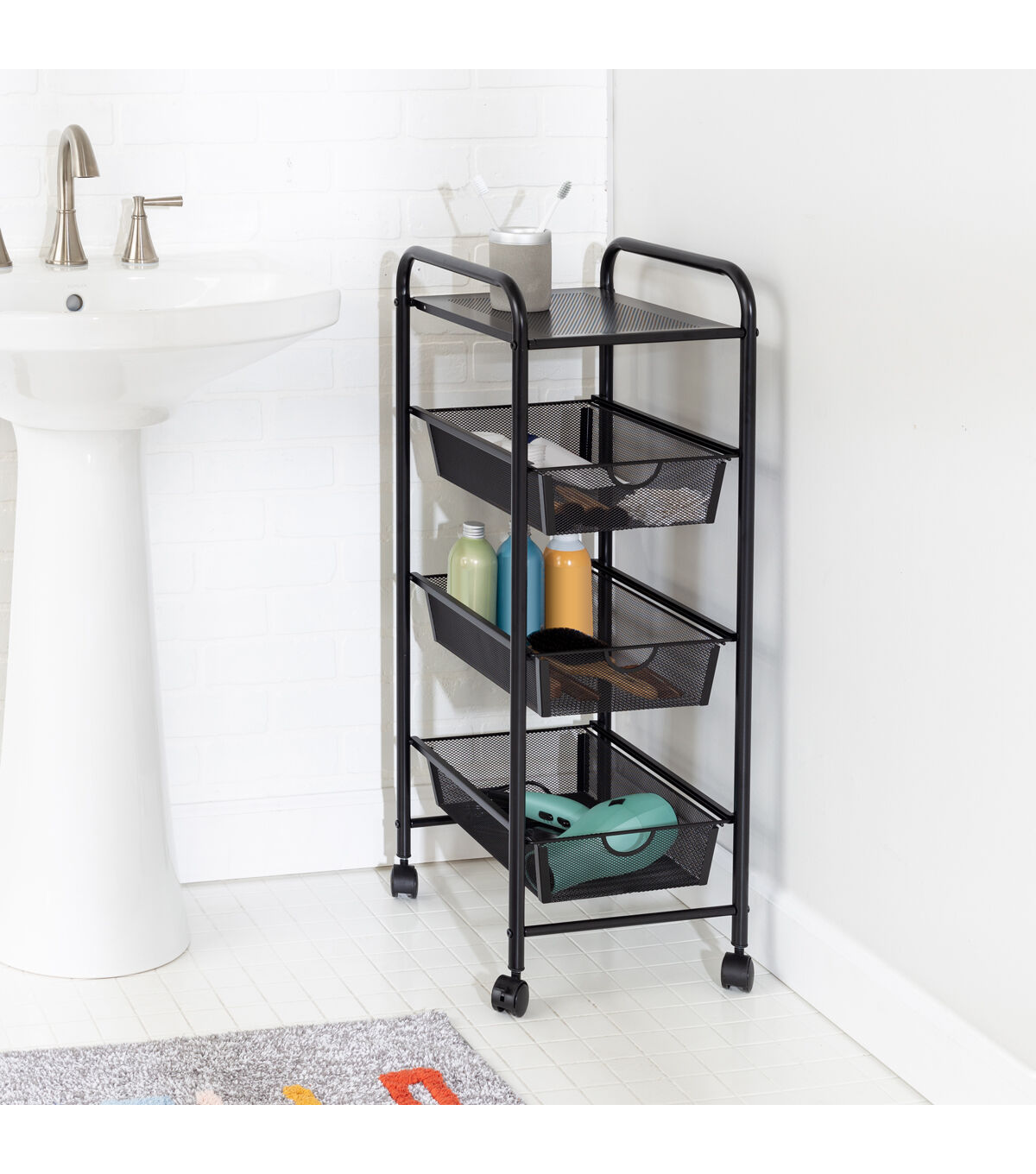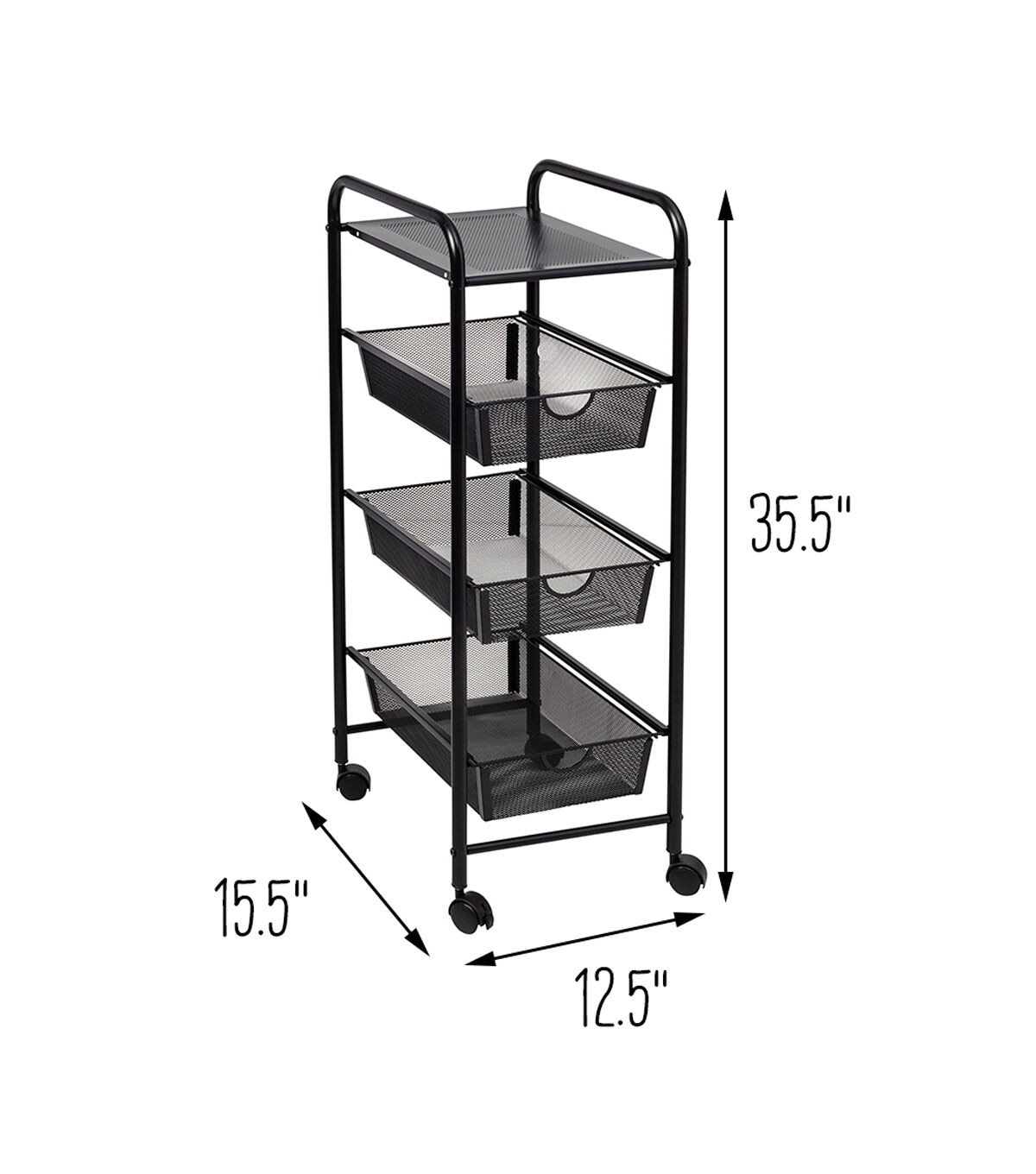 You can kiss the days of laying tall items down in drawers goodbye with this metal rolling cart! Fitted with 3 drawers with an abundance of headspace, there is plenty of room to stand up everything from hair products to condiment bottles in these spacious metal drawers. And you’ll never have to guess where you stashed away something thanks to the open mesh drawer design that provides easy viewing. With the addition of the top shelf, this rolling cart becomes a true organization hero. Whether rolling in to save your home office from chaos or gliding in to organize your kitchen, this sleek metal organizer with drawers will get the job done and push you one step closer to the tidy home of your dreams.