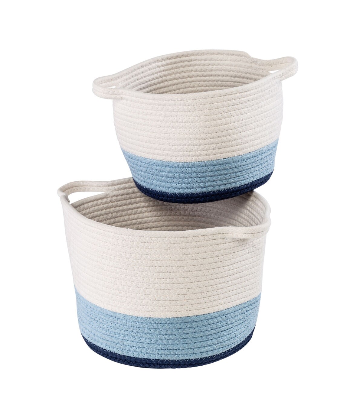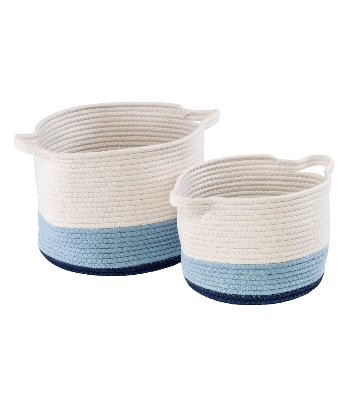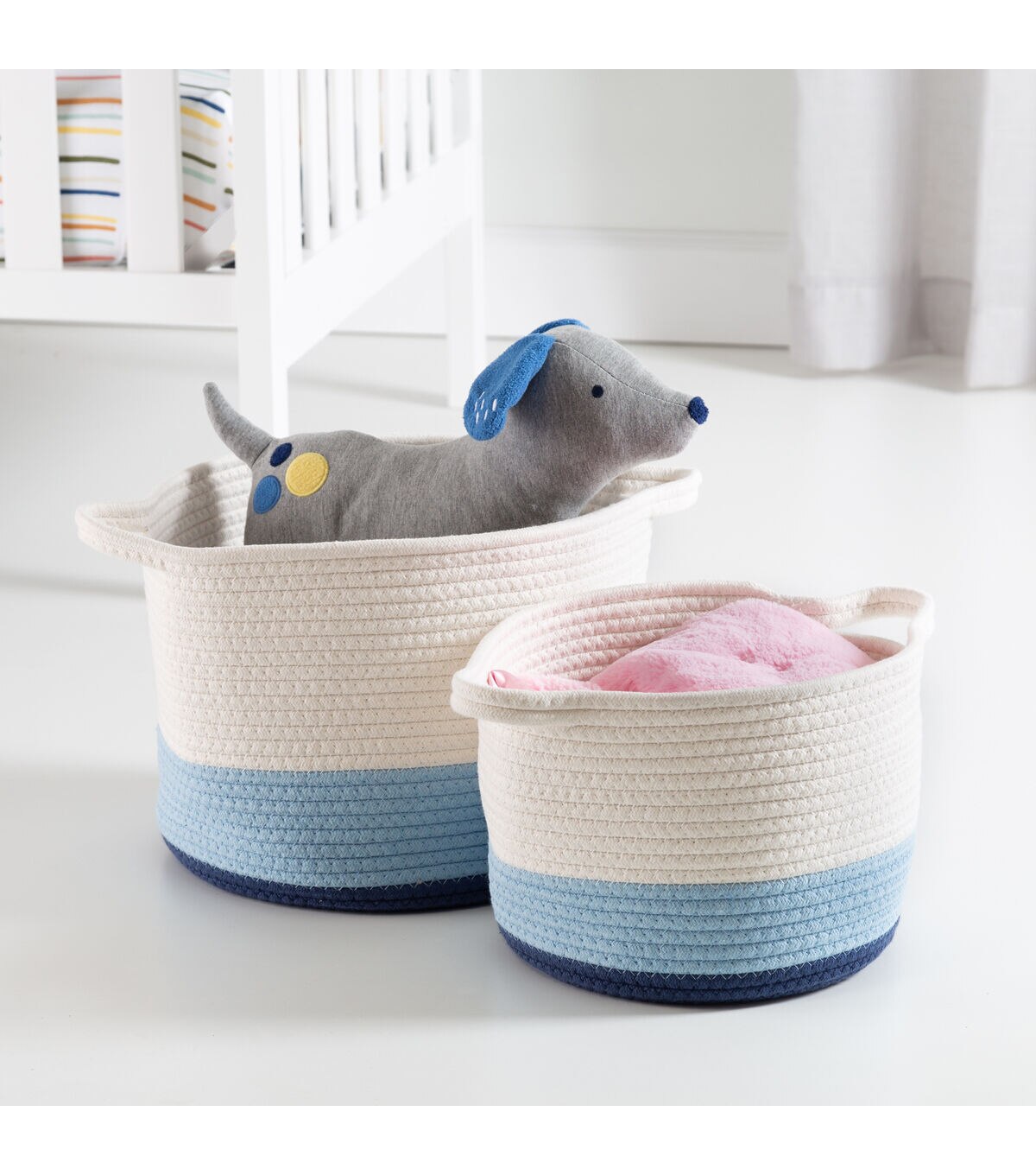 The sound of a tower of wooden blocks crashing to the ground? Our organizers’ eyes feel that sound whenever we walk into a room and see a heap of blocks littered across the floor. A quick, visually satisfying solution to this kind of clutter common to all households with humans under age five is this set of nesting cotton rope storage baskets. Finished at the bottom coils with a playful blue ombré effect, these baskets store and more. Tidy toys a playroom or hide cables in an office. A pair of handles make them handy to haul from room to room, triaging disorganization whenever it rears its somewhat charming but very grubby mug.