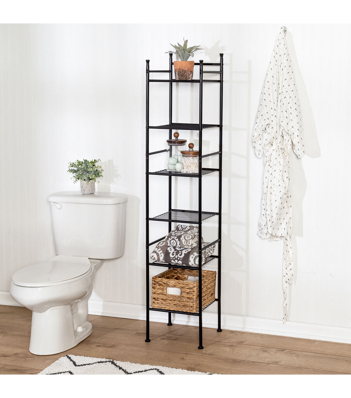 You’re looking for bathroom ideas to help you get organized. With not much floor space in your bathroom, you need to get vertical. This 6-tier bathroom shelving unit looks, and plays, the part. There is ample room to hold all your bathroom essentials and the bold black design makes it a statement piece. Or bring it into the living area or home office for additional vertical storage. Durable construction will stand the test of time and the functionality is flawless.