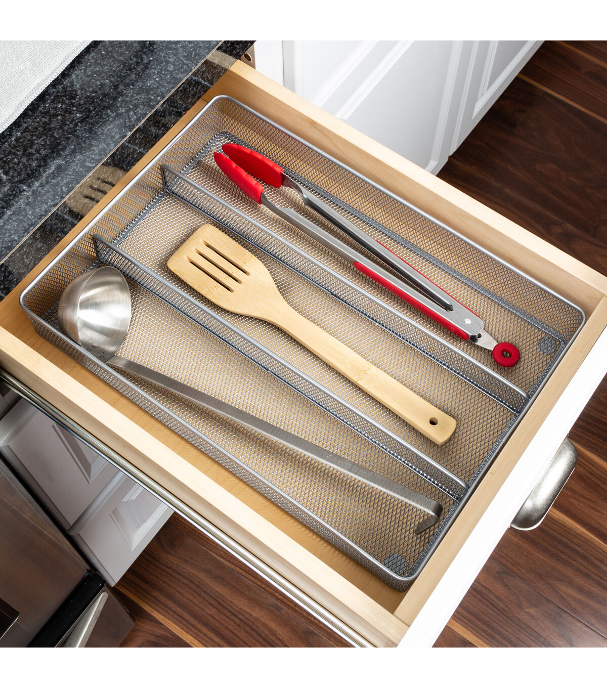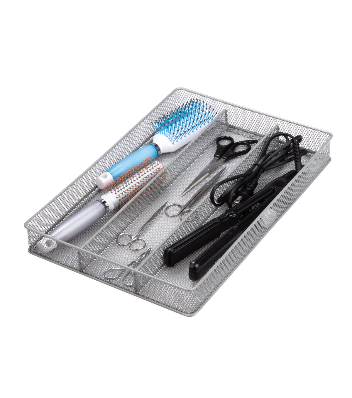 This 3-compartment drawer organizer fits all your standard flatware neatly in its own place. The mesh construction is easy to clean and its versatility is endless: Its 2-inch height makes it ideal for office storage, makeup storage, arts & crafts or even matchbox car storage.