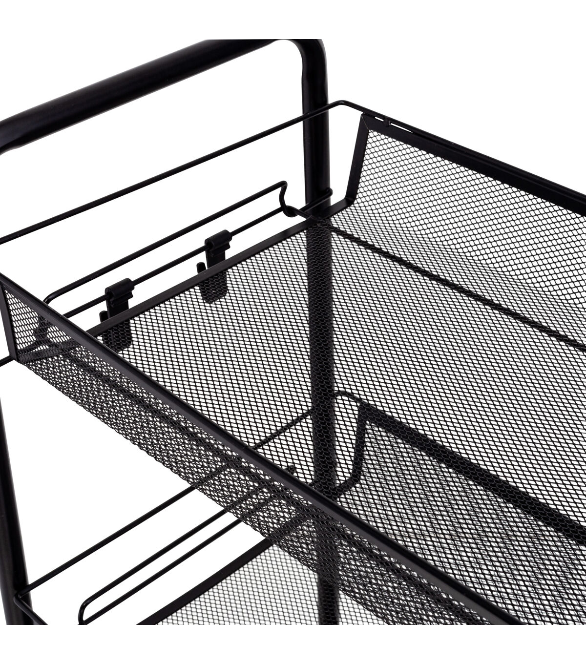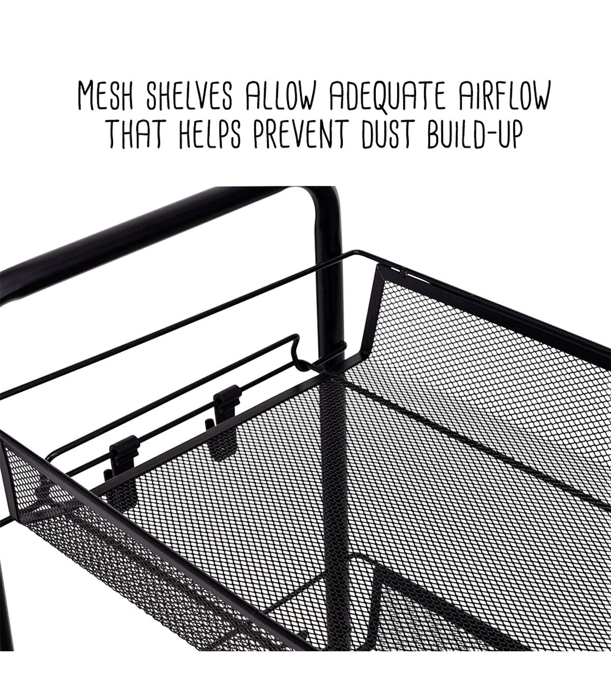 - Mesh shelves allow adequate airflow that helps prevent dust build-up, while their tray shape ensures nothing tumbles off when the cart is in motion