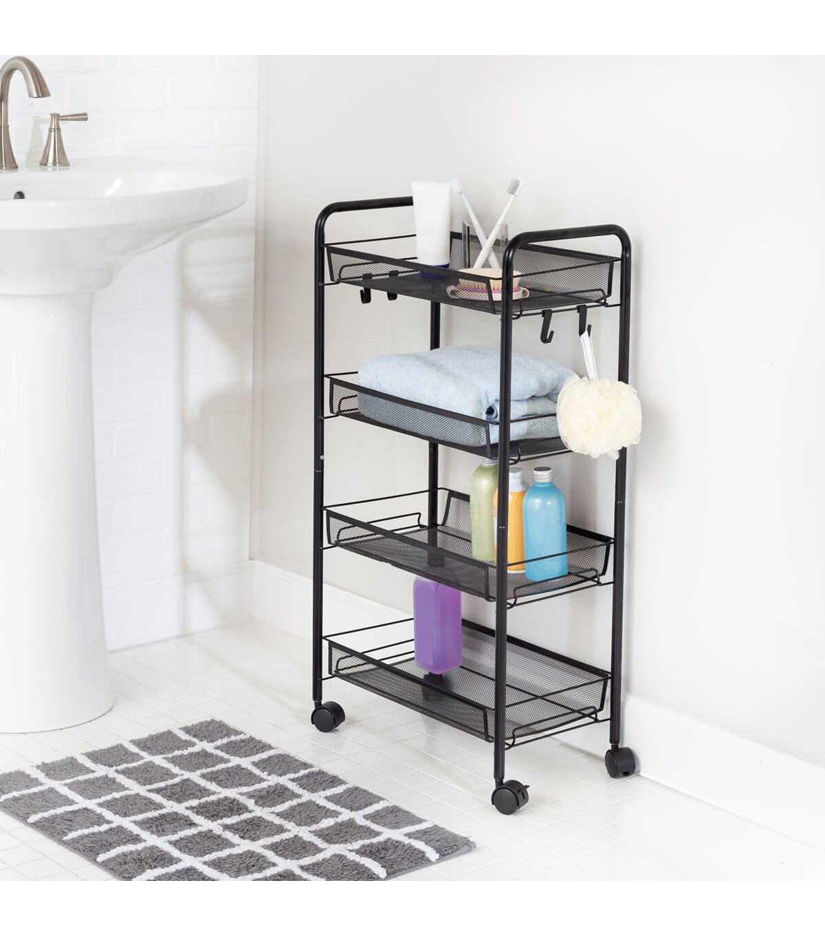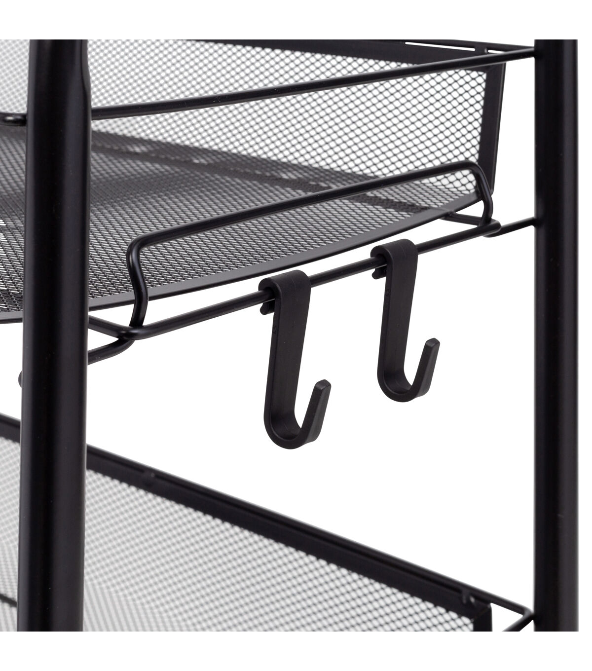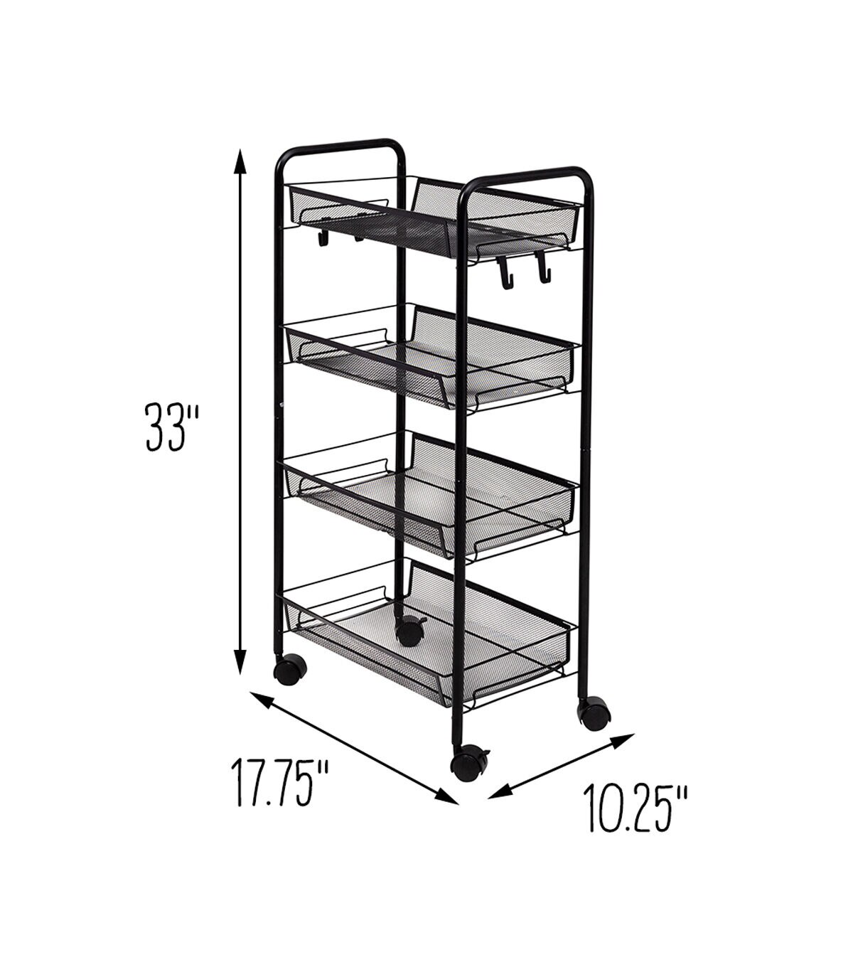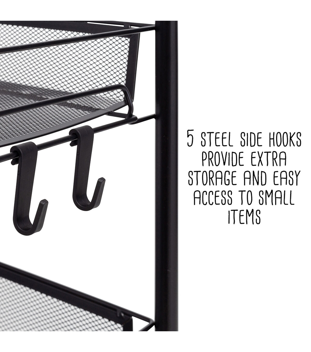 This metal cart with wheels will quelch your storage needs in an instant. Whether you decide to use it as a rolling kitchen cart or a modern black bar cart, the wheels provide a smooth ride, while the 4 tray-shaped shelves keep all your items corralled. Need to keep items easily accessible? The 5 side hooks are a simple yet powerful addition that will hold everything from cooking utensils to hair accessories within reach. Once this versatile utility cart rolls into your home, you won't know how you ever lived without it!