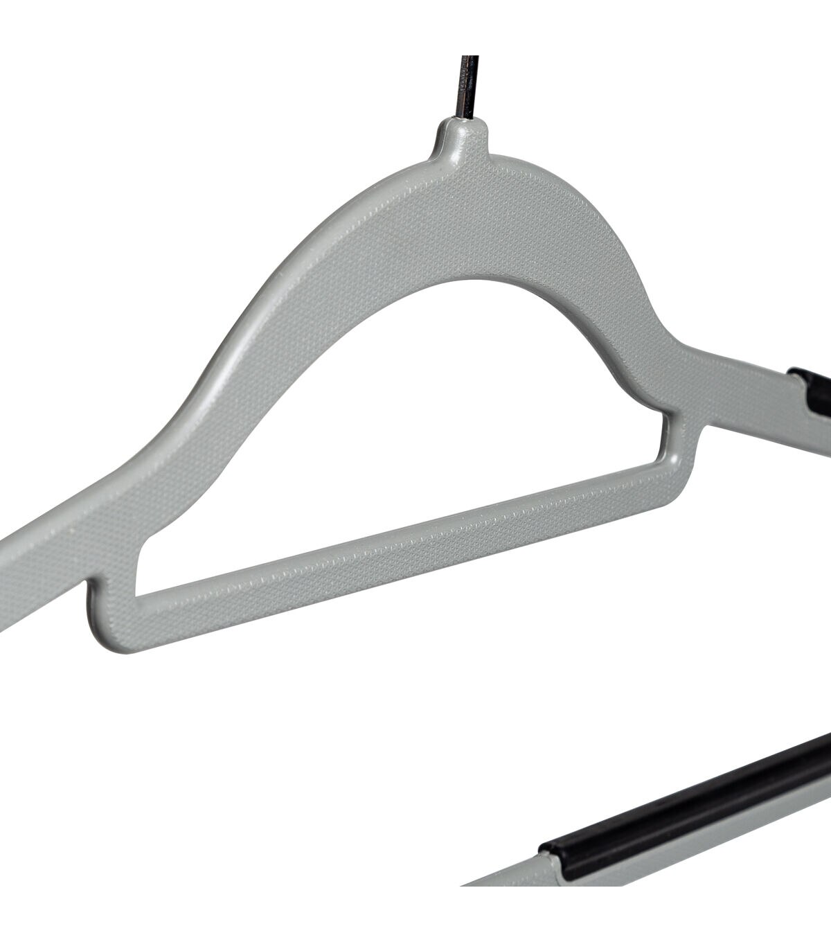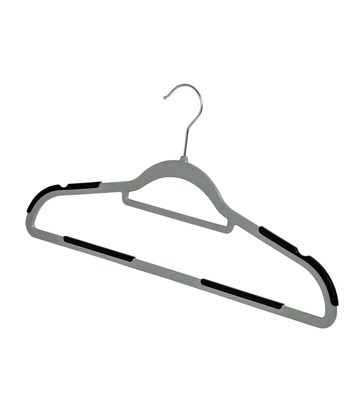 Your closet just got bigger! These slim profile hangers make more space for your clothes to breathe in your closet. The rubber grip shoulders and cross-bars provide no-slip hanging for slippery blouses, scarves and more. Combine multiple 15-packs of grey hangers to cover your entire wardrobe.