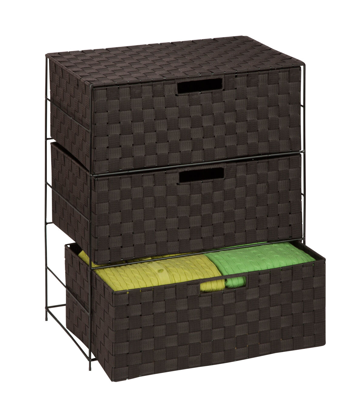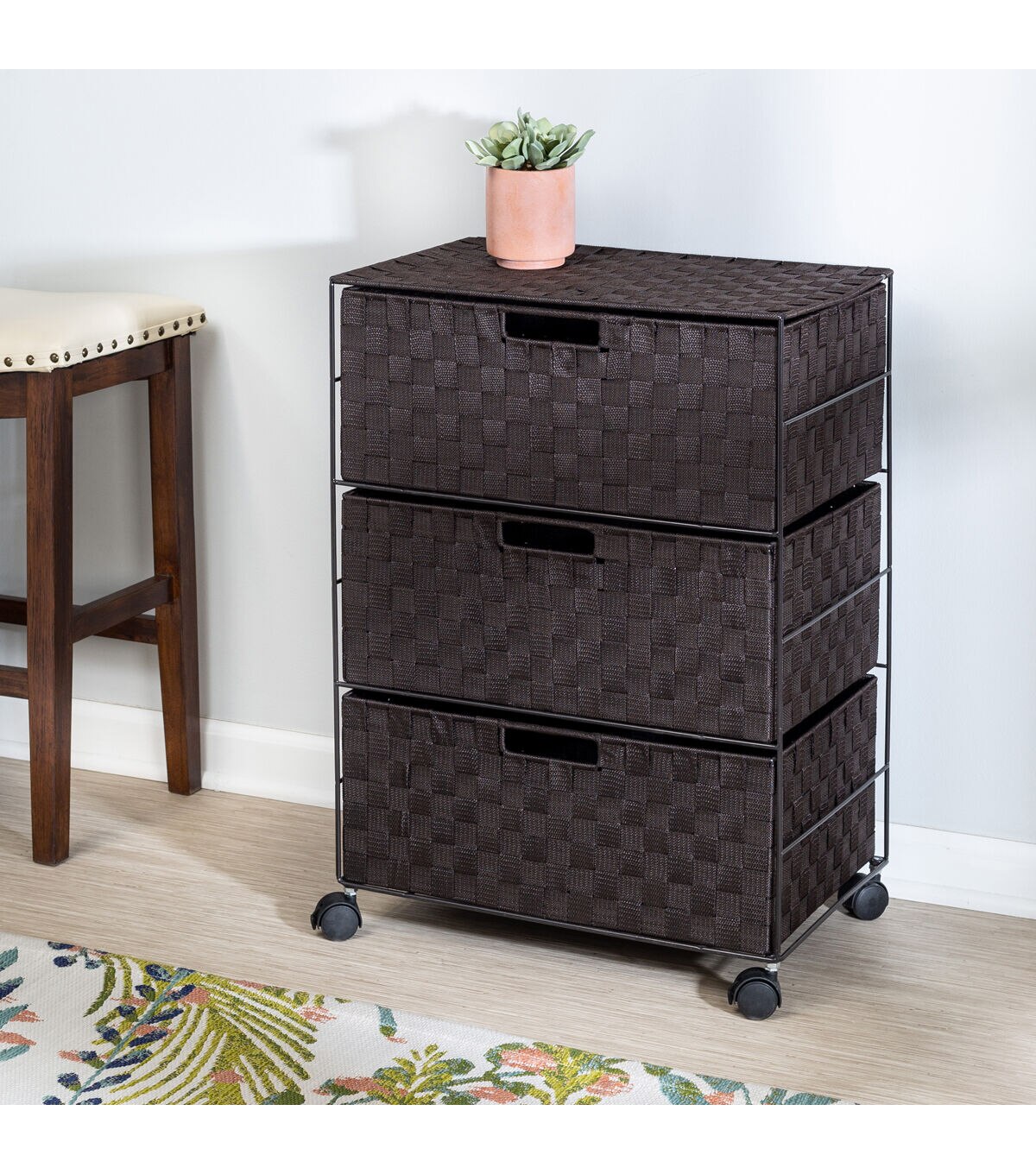 Getting organized has never looked better with this impressive double woven chest. This storage unit has three spacious drawers with handles to hold clothes, tools, office supplies or anything else that needs tucked away. Smooth rolling casters make moving the chest a breeze, and a soft top surface provides even more storage space. Coordinates with other pieces in Honey-Can-Do's collection of double woven products.