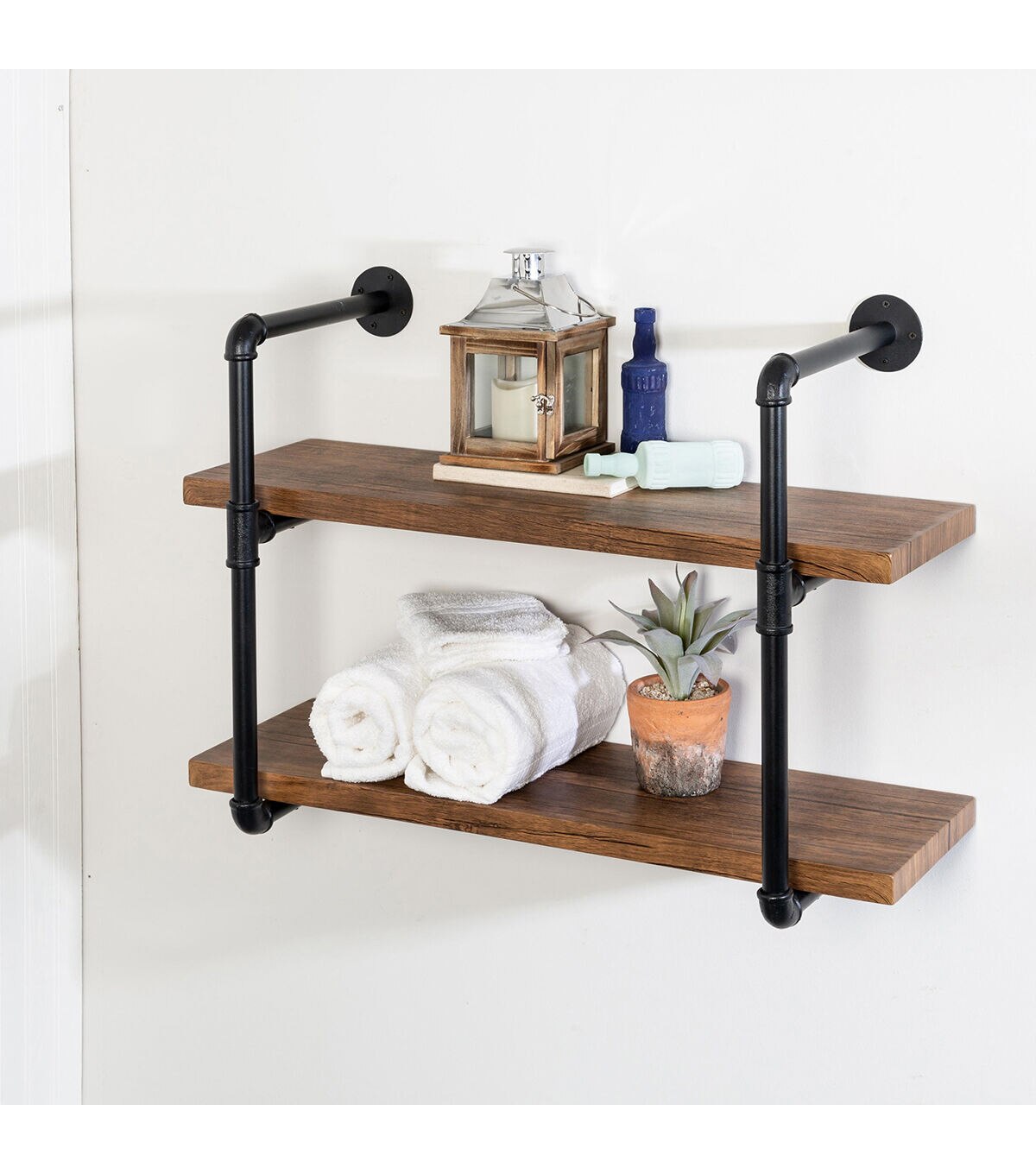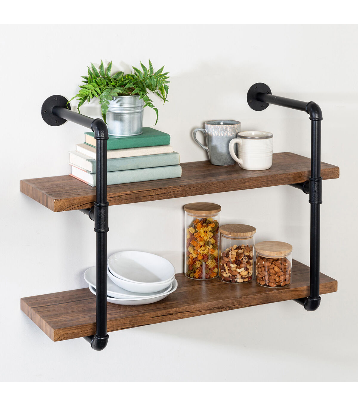 Vertical storage never looked so good. Display picture frames, books, plants, whatever your heart desires, and do so with style with this 2-tier black industrial wall shelf that holds up to 30-lbs per shelf. Easy assembly will have you up and running quickly, and the sleek black piping frame will add elegance with a touch of edgy to your space.