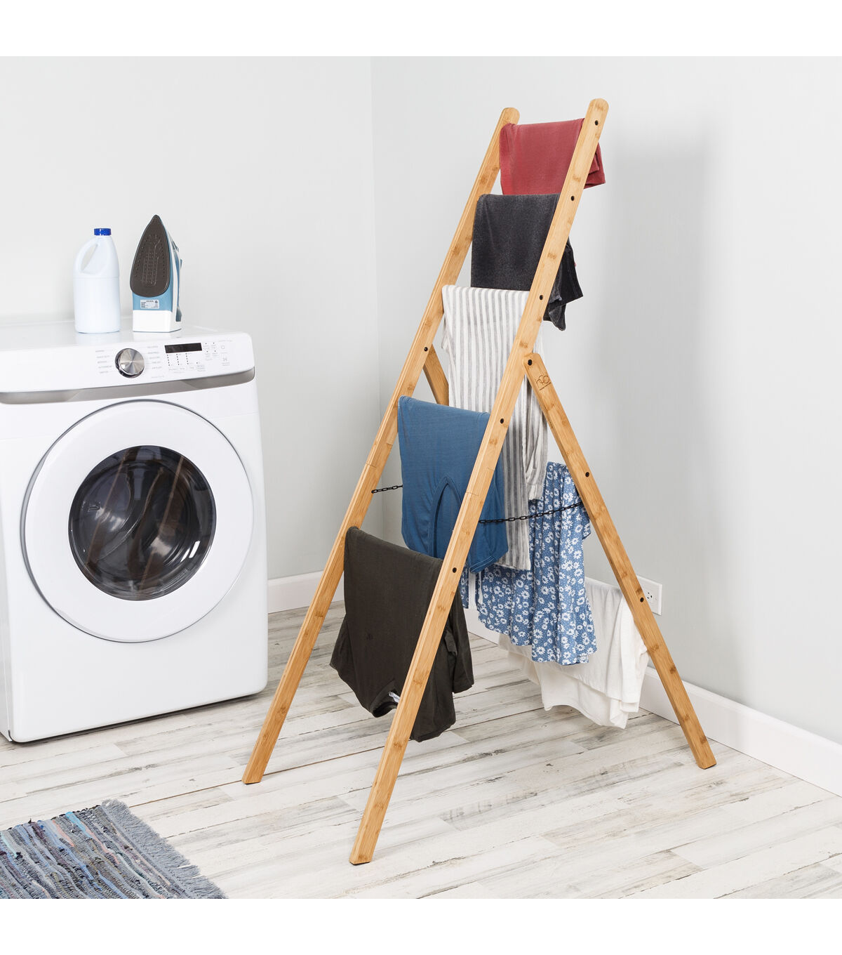 This ladder rack leans cleanly and is a welcome design and storage addition to any room. Air dry your clothes or simply keep throw blankets, towels or clothing accessories close while giving your space a fashionable decor accessory of its own. Versatility is paramount when it comes to clothes storage, and the bar spacing allows for easily storing varying garment sizes or a combination of clothes and accessories. An added bonus, the ladder rack's sustainable bamboo make-up and energy savings from not using your dryer give you double the points on your earth friendlness, and the safety chain allows for added functionality and angle adjustability, making this the perfect addition for your room.