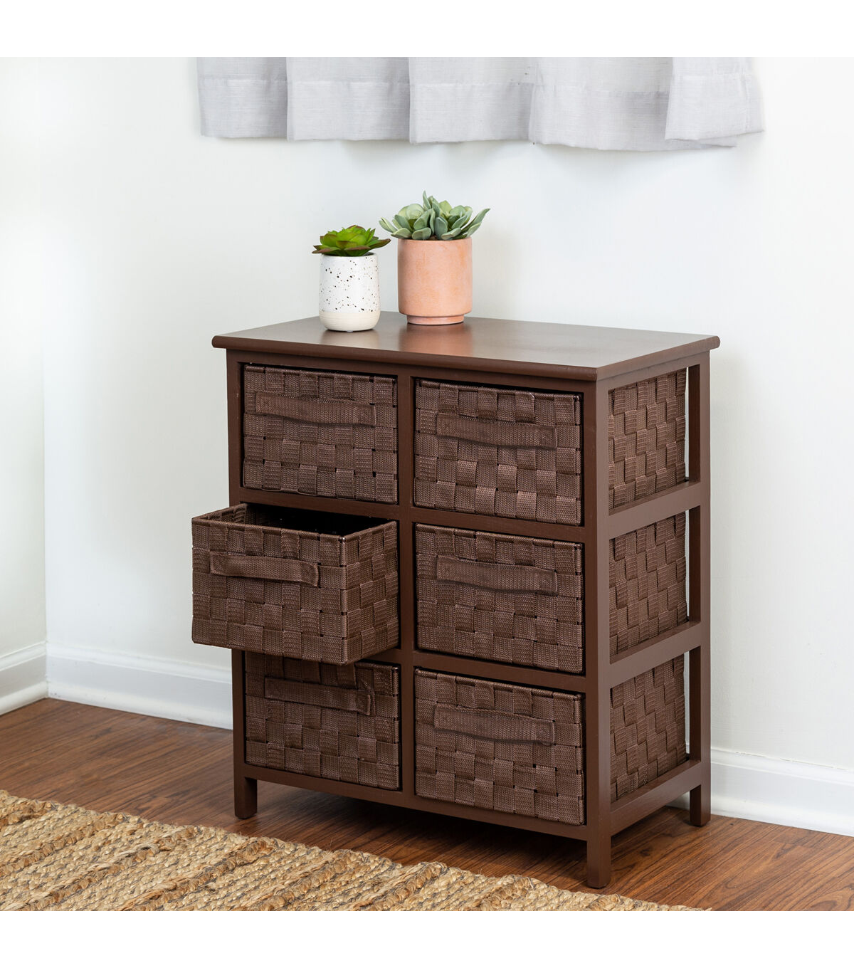 Getting organized has never looked better with this impressive double woven chest. This storage unit has six spacious drawers to hold clothes, tools, office supplies or anything else that needs tucked away. A natural wood top surface provides even more storage space and can double as a night stand. Coordinates with other pieces in Honey-Can-Do's collection of double woven products.