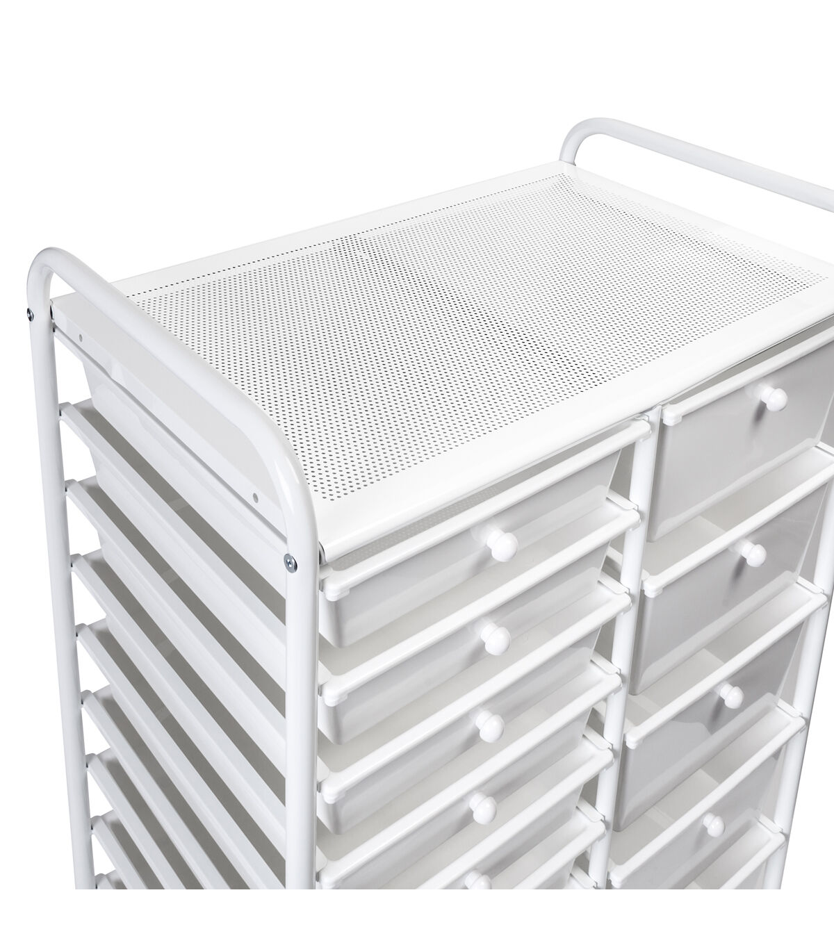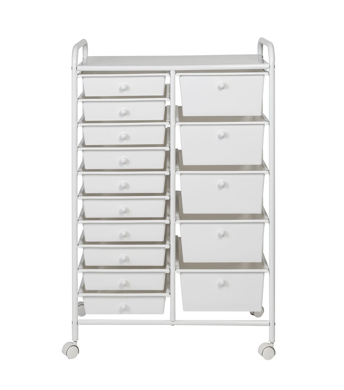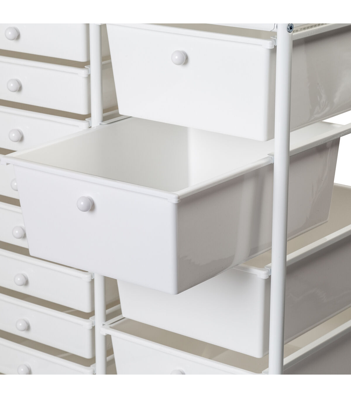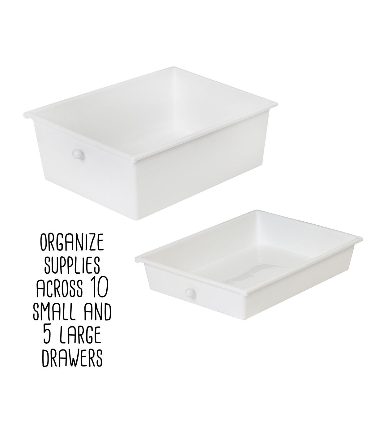 - Organize across 10 small and 5 large white drawers with white knobs