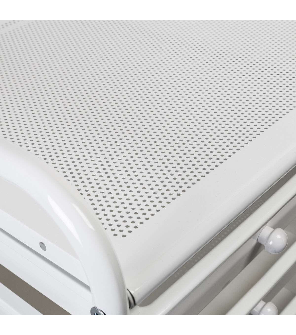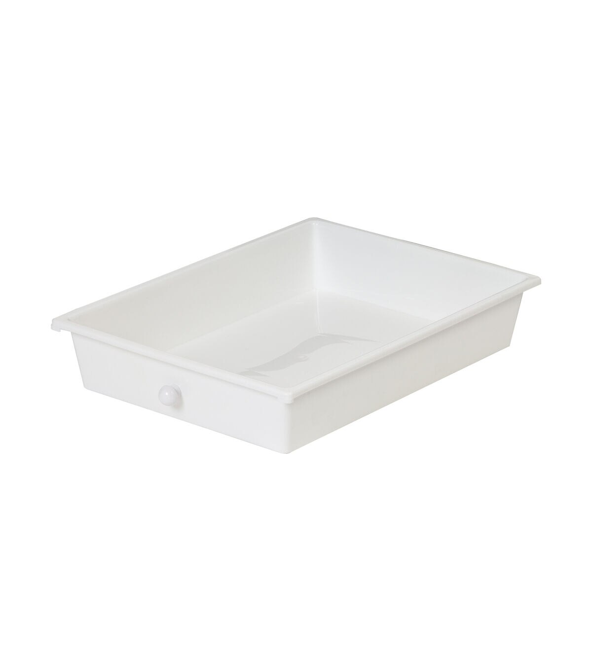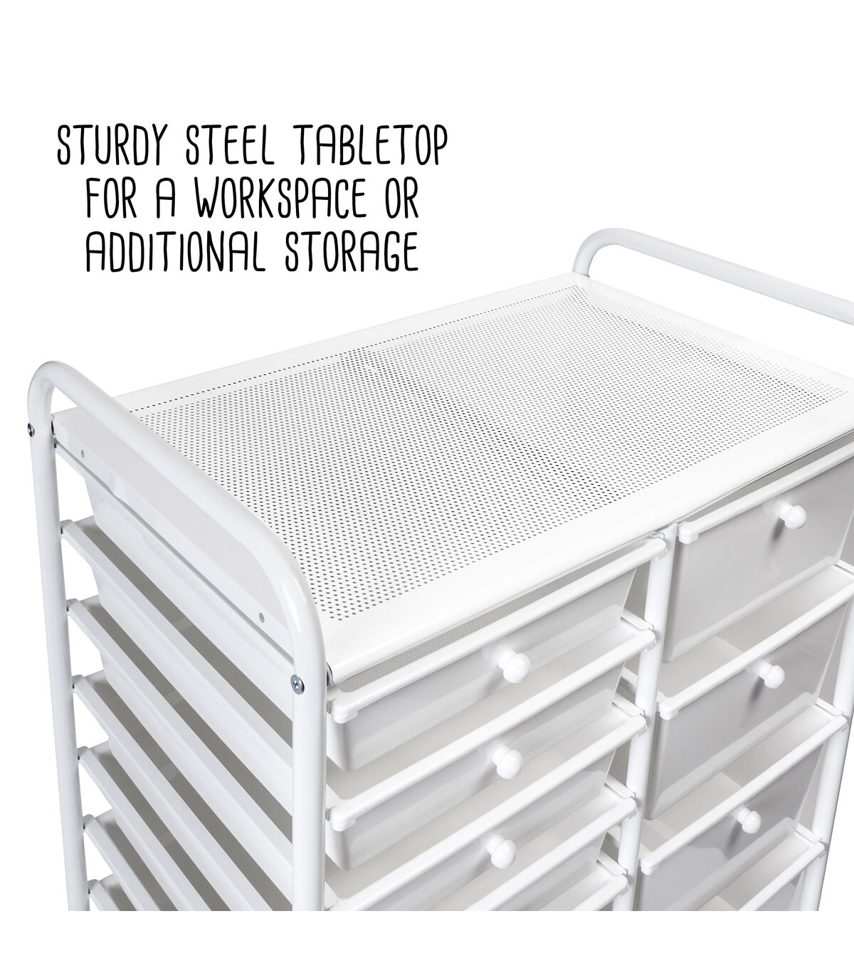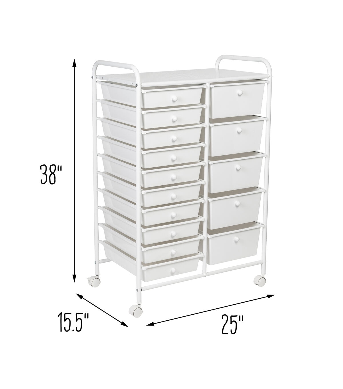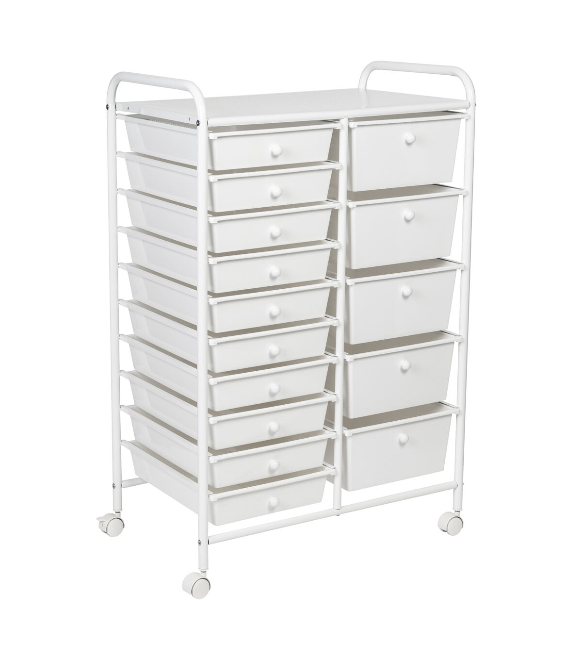 - Organize across 10 small and 5 large white drawers with white knobs