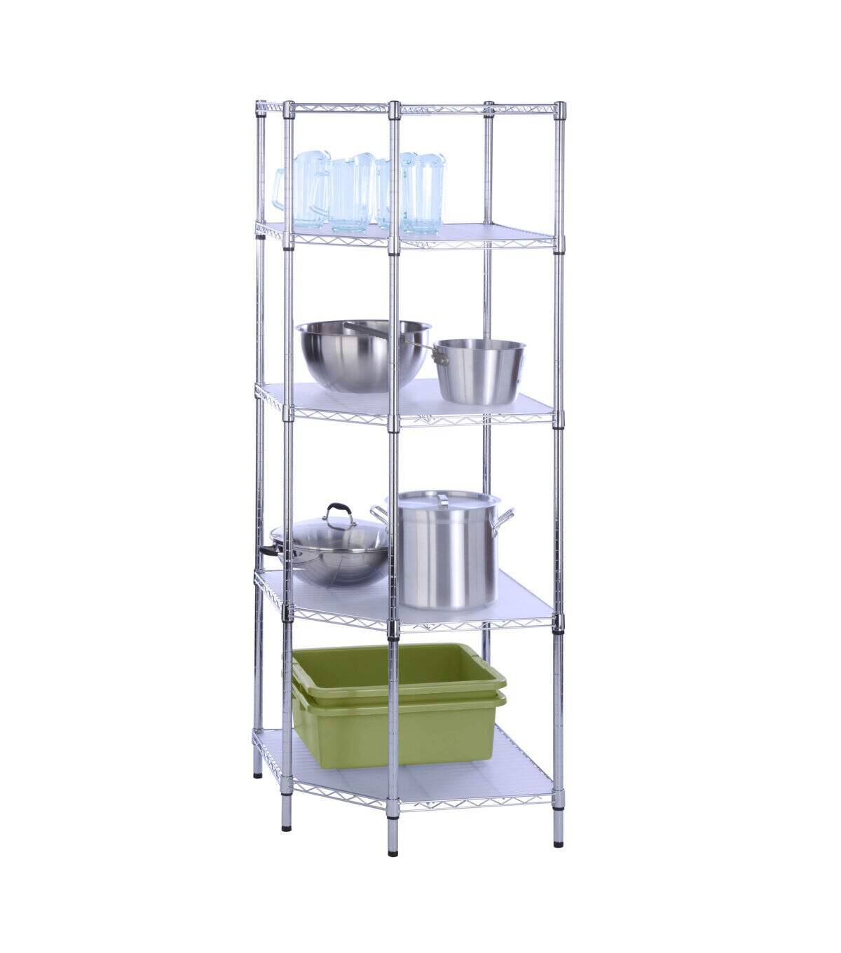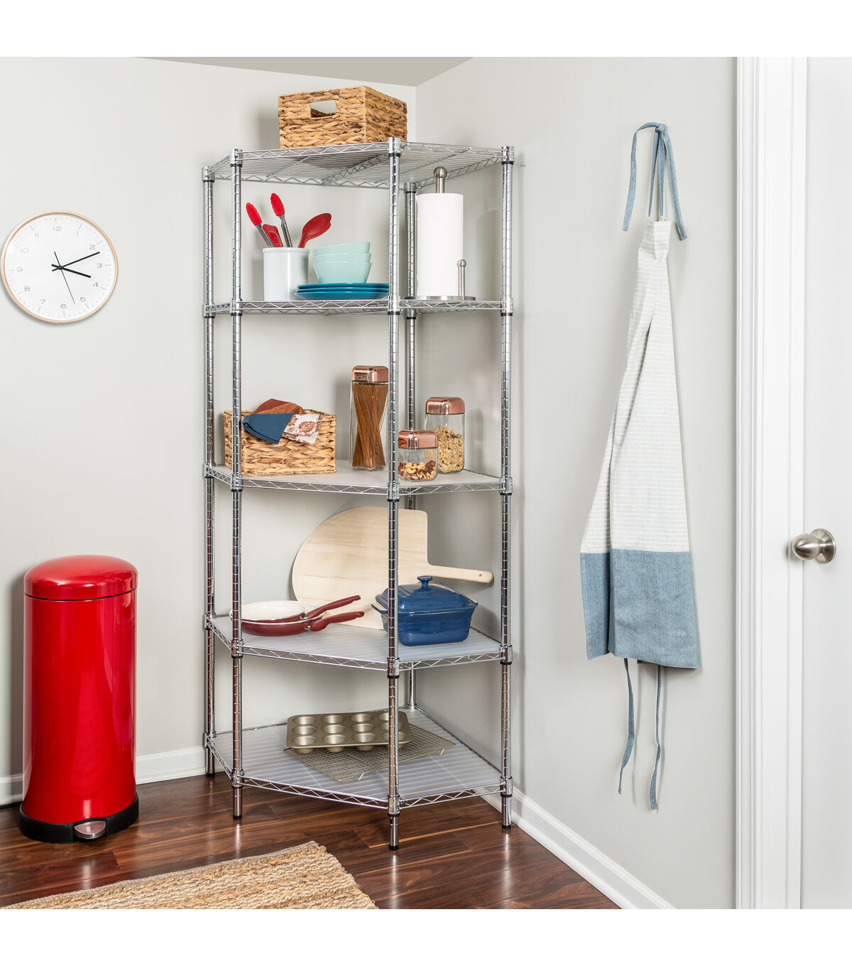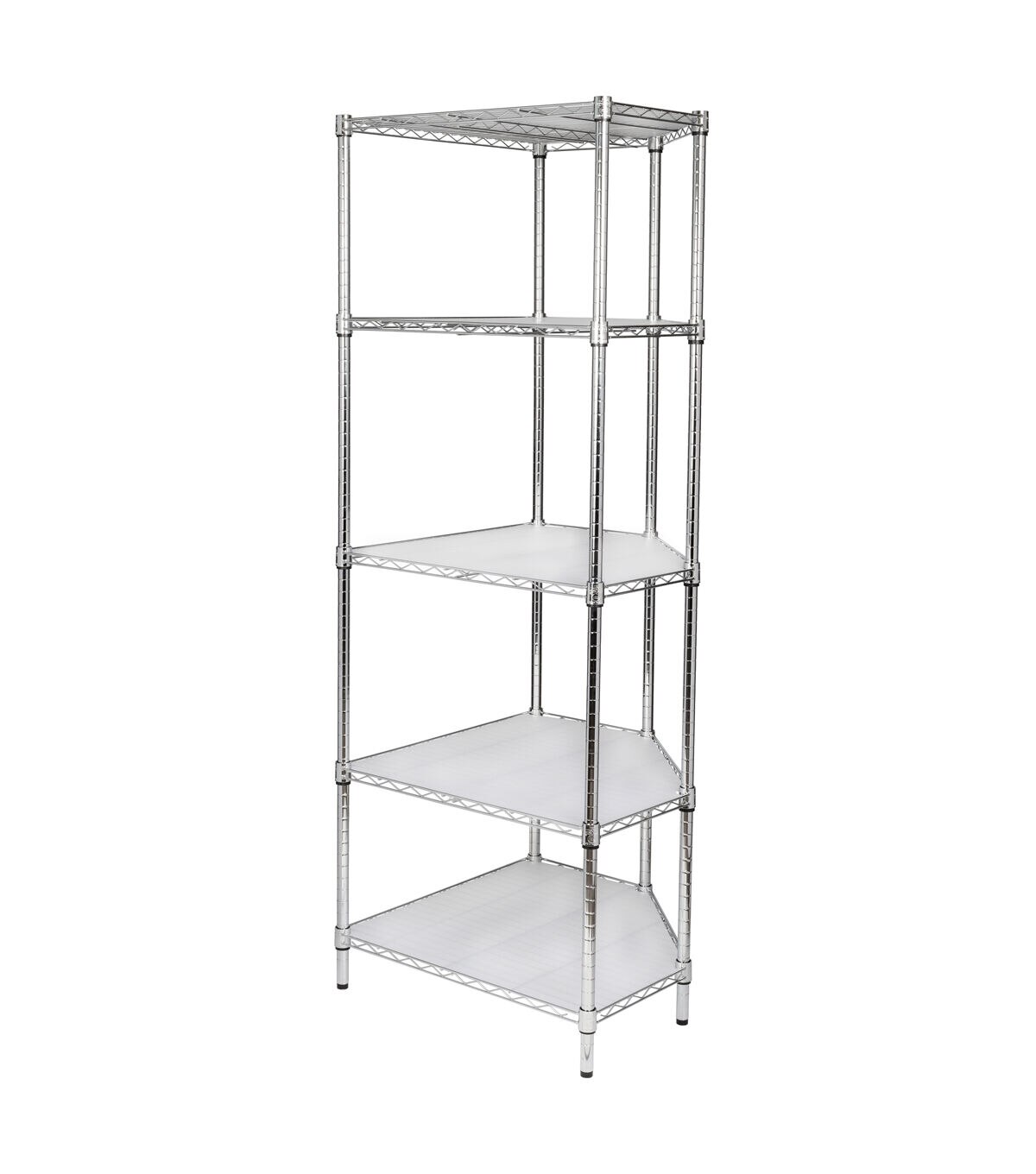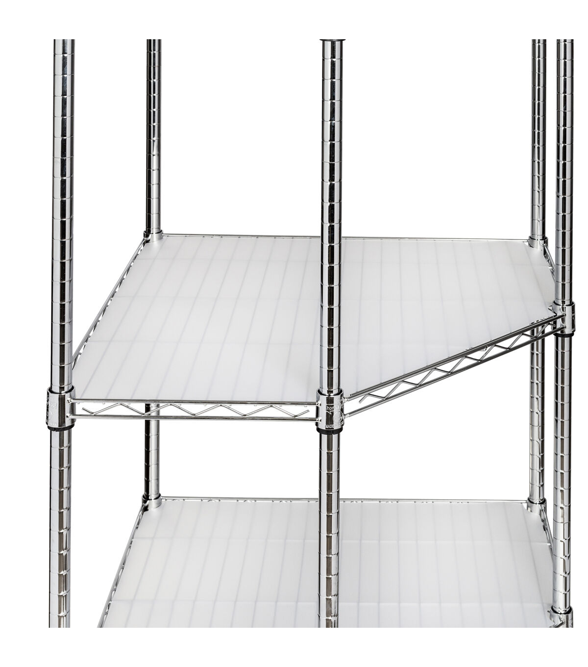 Create visible, accessible storage space instantly with Honey-Can-Do industrial shelving systems. Contemporary chrome finish and 72" steel frame make this unit the perfect blend of style and functionality. Durable enough for the mudroom, garage, or commercial kitchen; this unit is capable of withstanding up to 350lbs per shelf and its unique design makes it perfect for a corner. Adjustable shelves allow you to change the configuration as your storage needs evolve. Clear shelf liners included.