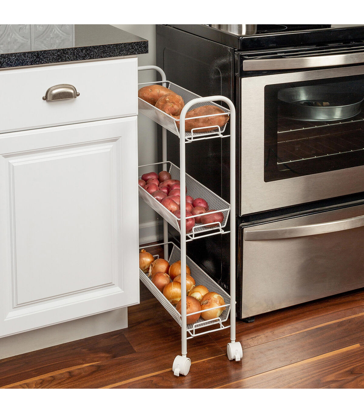 You're a mover and a shaker. So whether it's storing laundry, kitchen or bathroom accessories, this slim storage cart rolls right along with you for when you need it and slides neatly into smaller spaces.